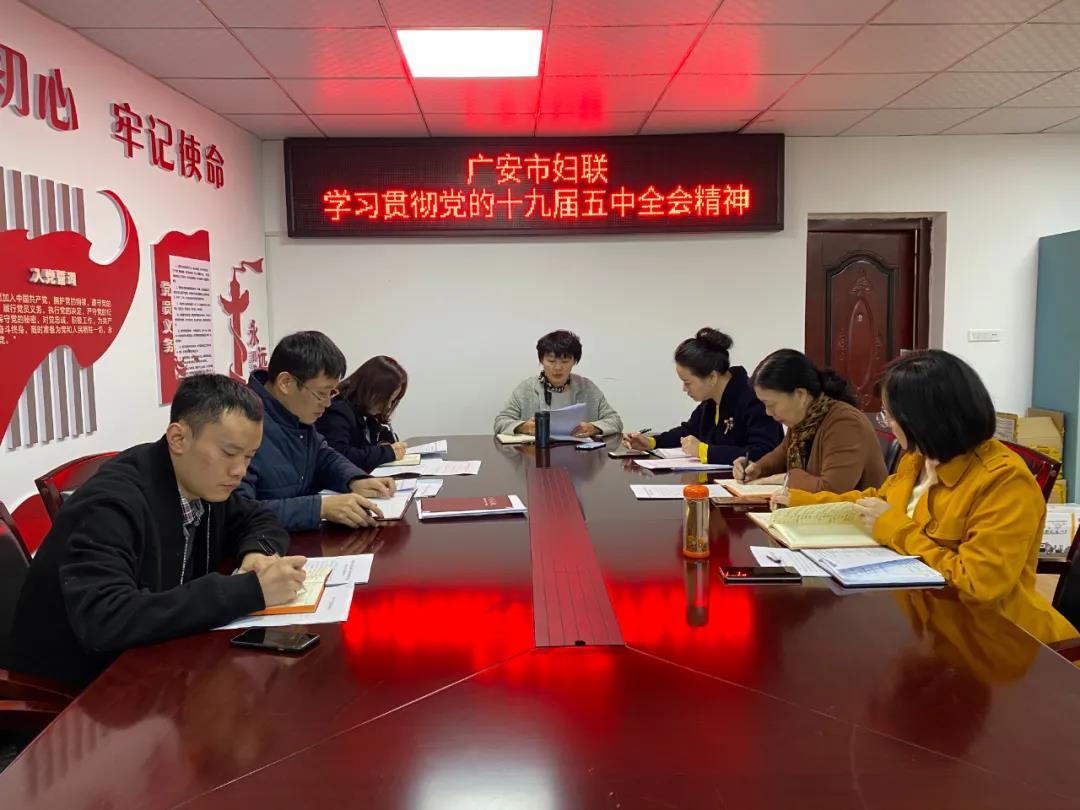 近日,广安市妇联召开党组中心组扩大学习会,专题学习党的十九届五中全会精神,学习了《中国共产党第十九届中央委员会第五次全体会议公报》,讨论研究贯彻落实措施。