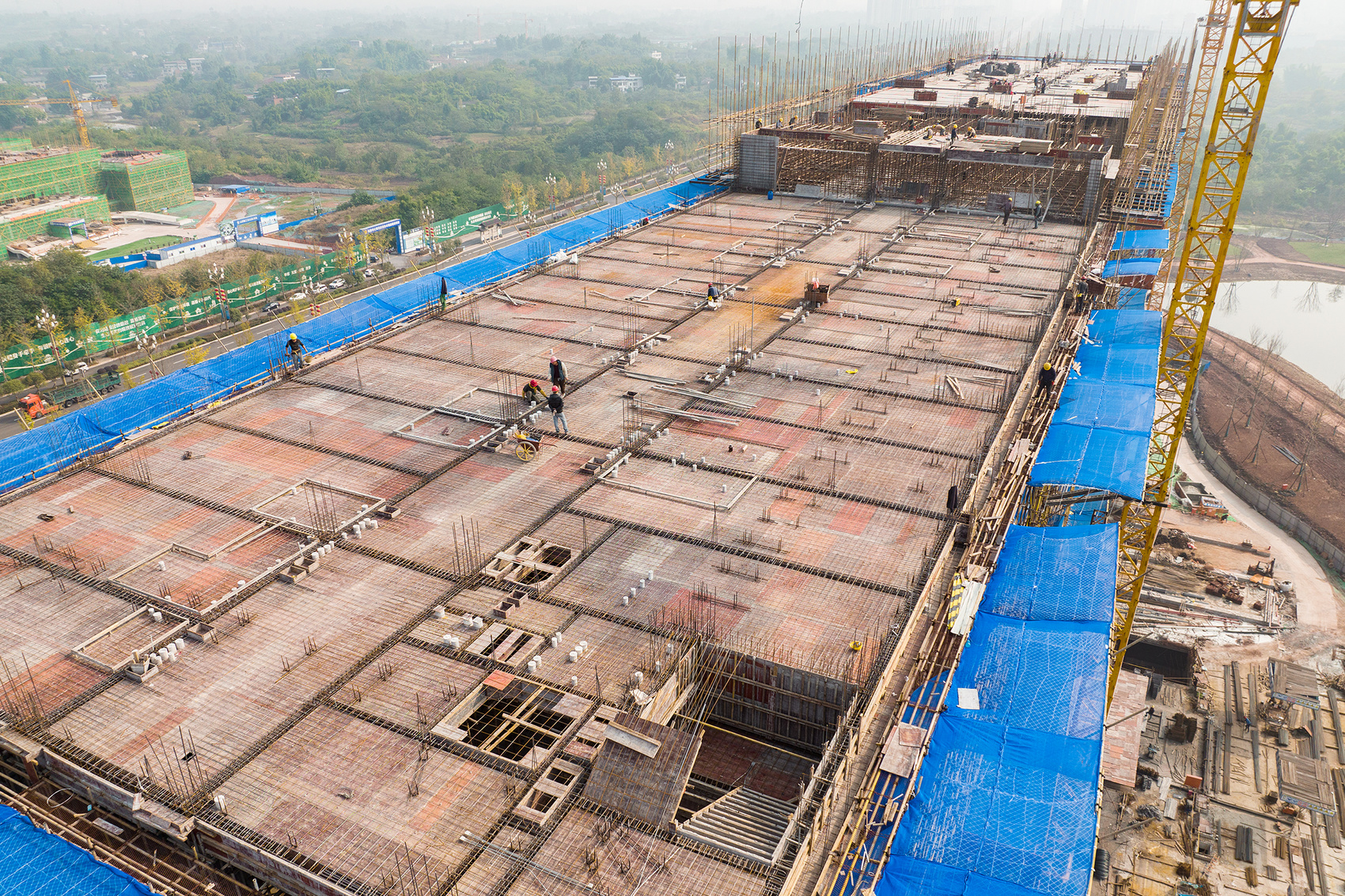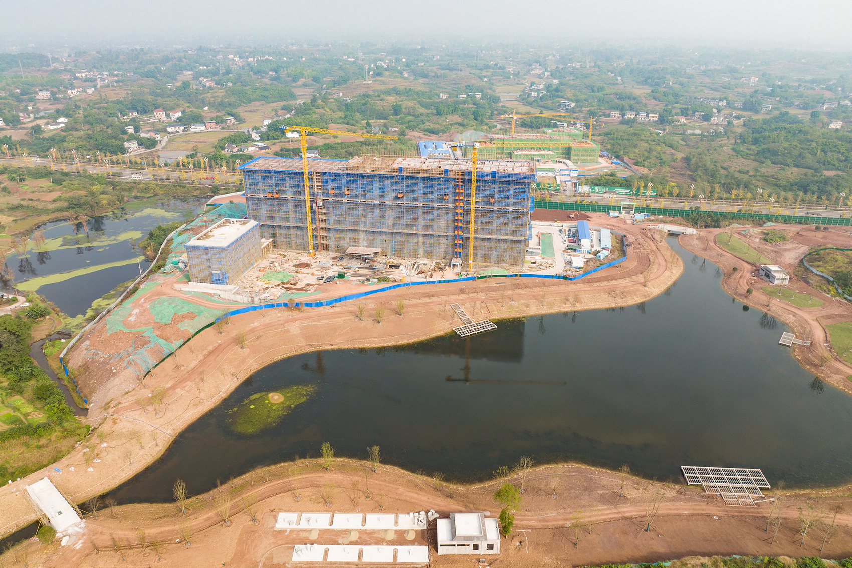 12月5日,隆昌市西部新区温德姆酒店项目建设现场,200余名工人分散作业,切割钢筋、安装门窗、抹灰、做防水工程,一片繁忙的景象。从空中俯瞰,环绕着温德姆酒店,生态绿地、慢行步道等基础设施建设同步进行中。