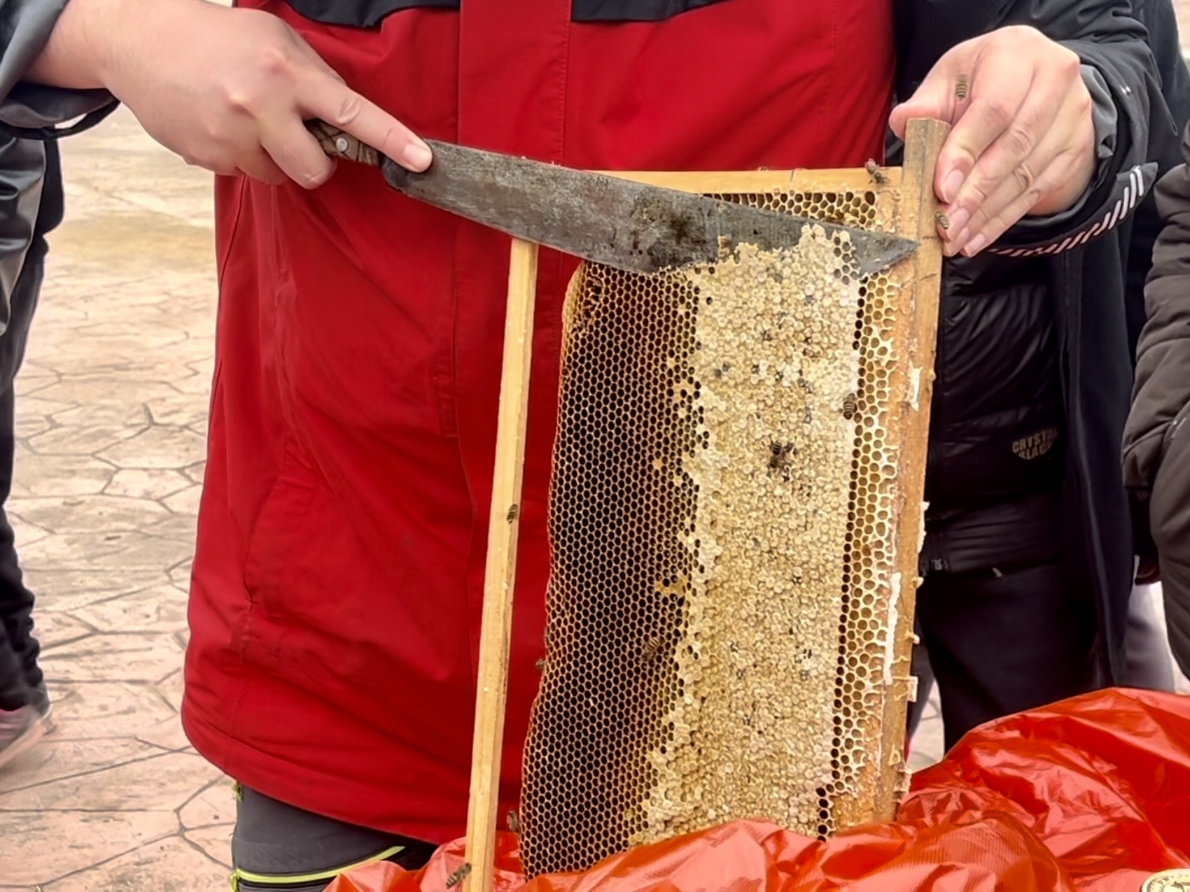 养蜂人切开蜂脾准备摇蜜。袁宇君 摄