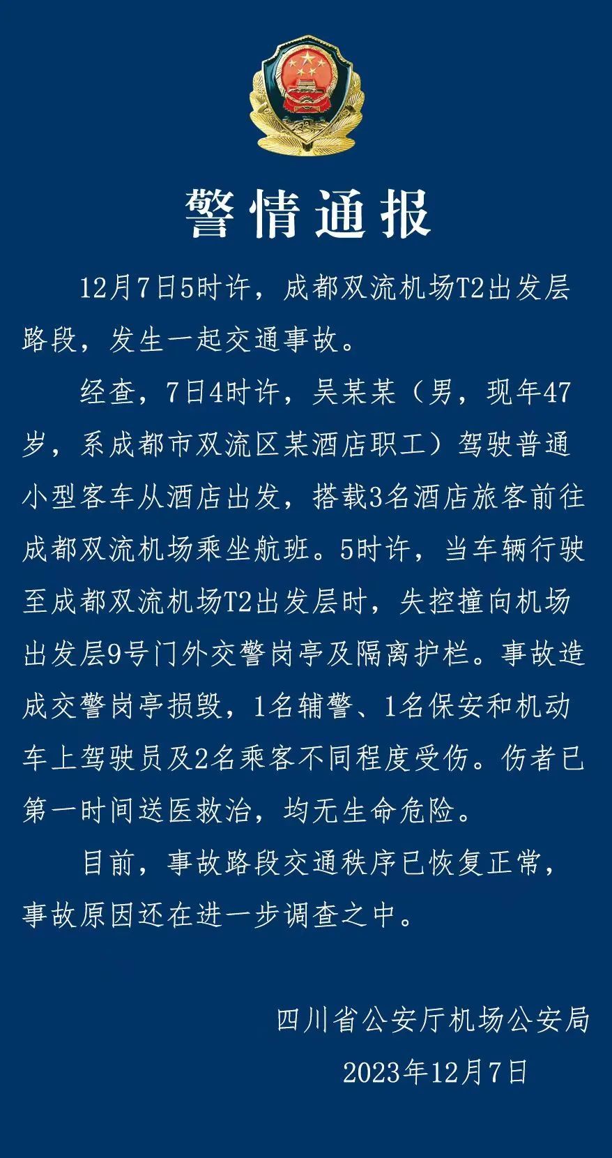 12月7日,成都双流机场出发层进站区发生一起交通事故。四川机场公安发布警情通报:
