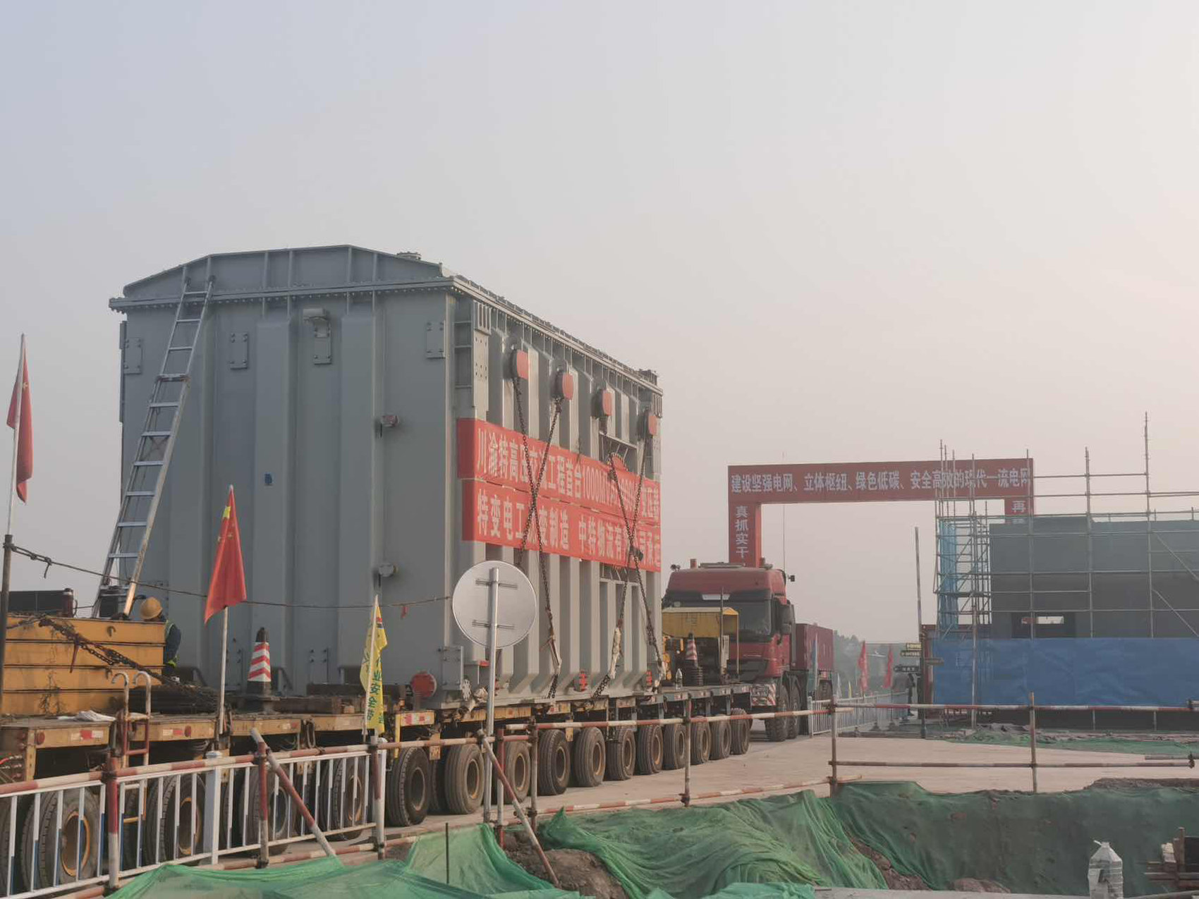 川渝1000千伏特高压交流工程首台变压器运抵成都东特高压变电站建设现场。