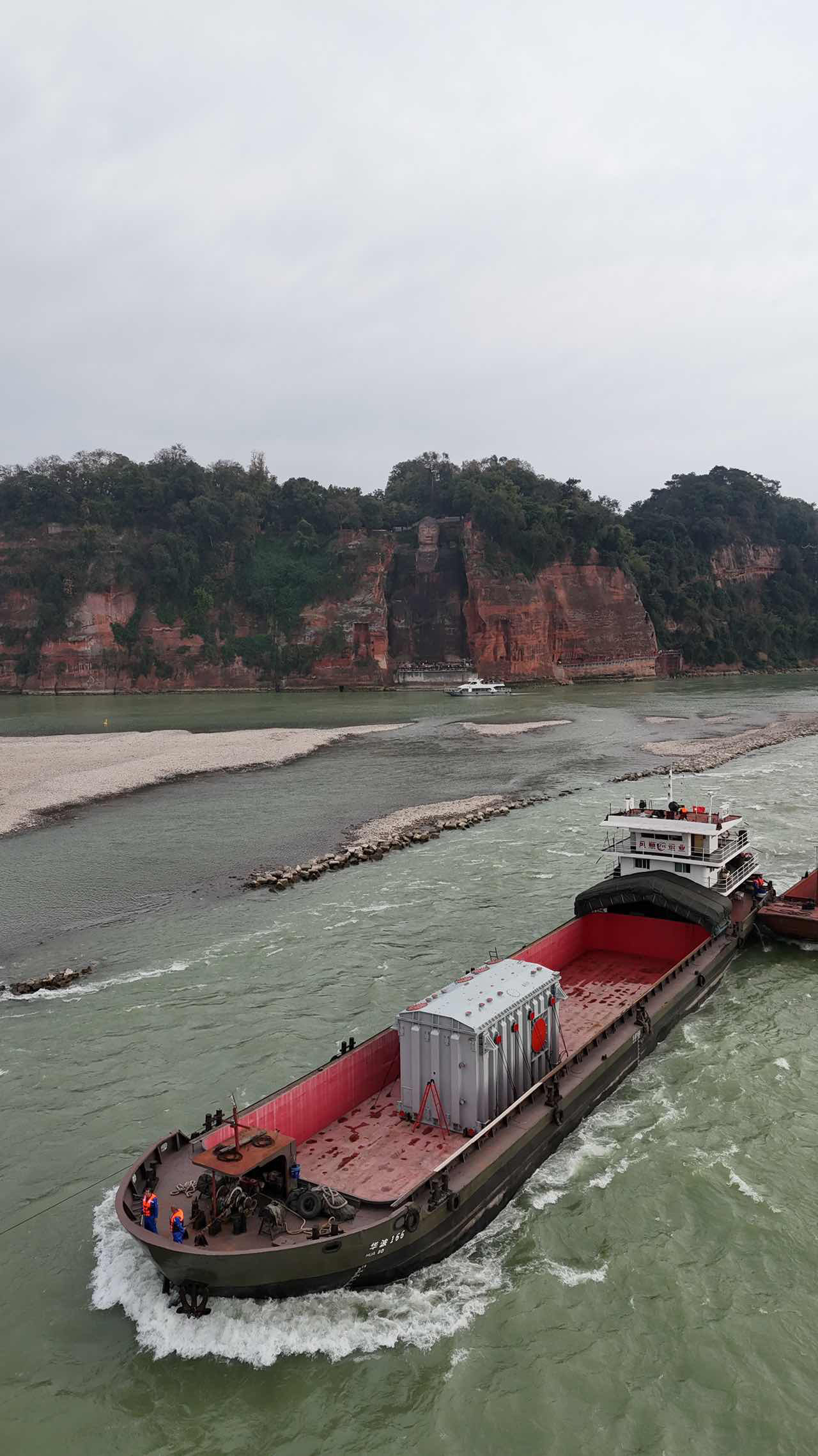 巨大的体积和重量给运输工作带来了诸多难题。其中,在岷江163公里航段中,四川宜宾至乐山海拔落差约100米,弯道多,水深浅,进入枯水季节搁浅风险大。“我们采用货船拖拽和四艘小吨位、大马力小型货船交替助推、伴航,浅滩位置通过 ‘二拉三推’的方式推动运输船前行。”运输负责人丁耀东说。