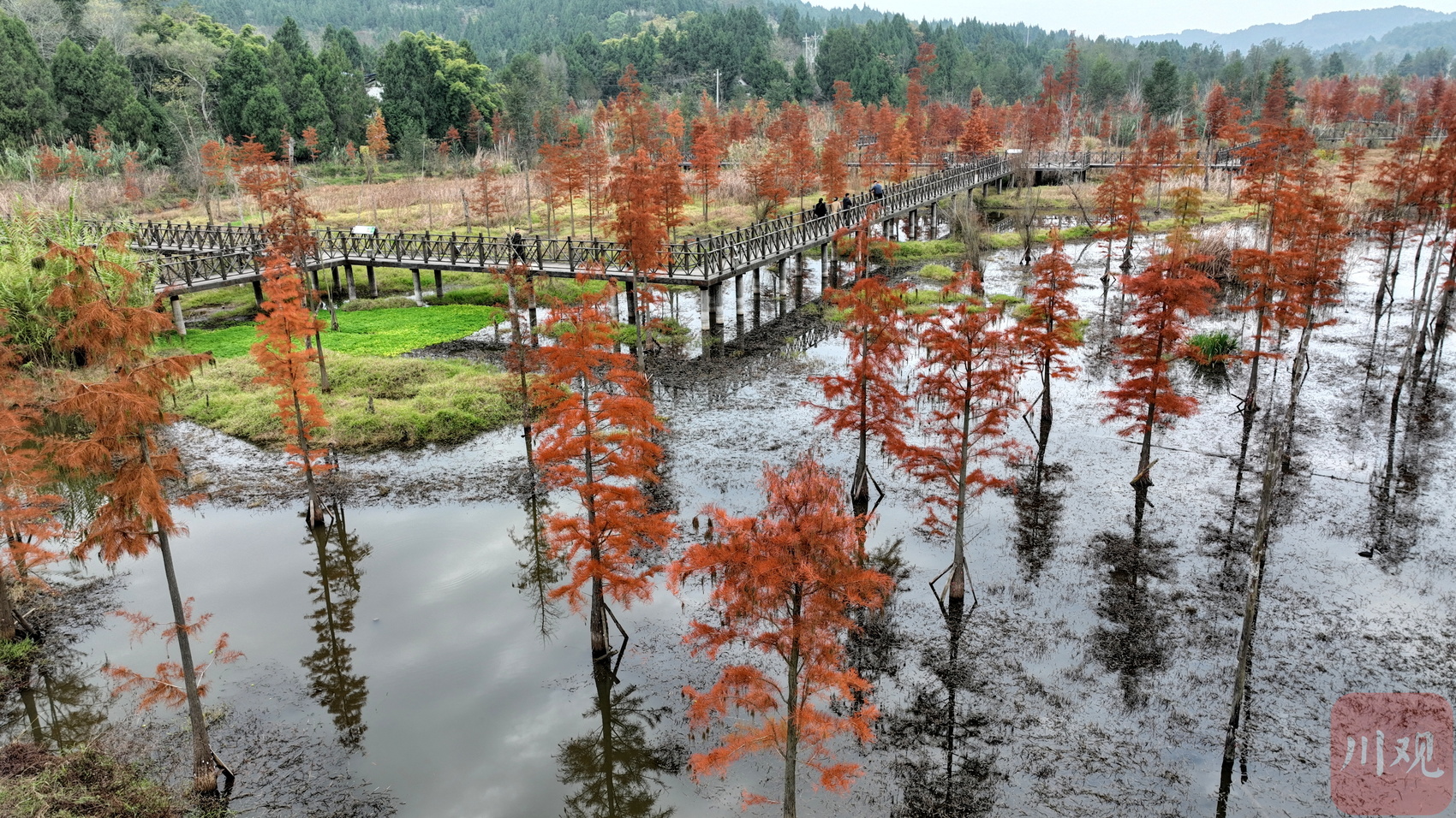 南充市营山县清水湖国家湿地公园内层林尽染,构成了一幅秀美的湿地生态系统景观图。