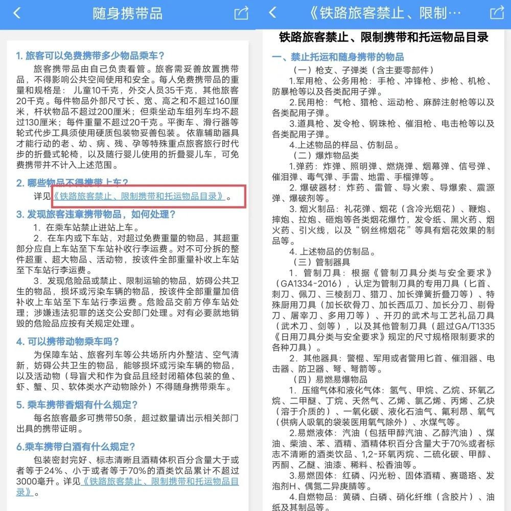 注:详细要求以《铁路旅客禁止、限制携带和托运物品目录》及当地客运部门要求为准。更多物品详情可以在12306网站、12306App查询,各车站公示栏也有展示,旅客可提前查阅。