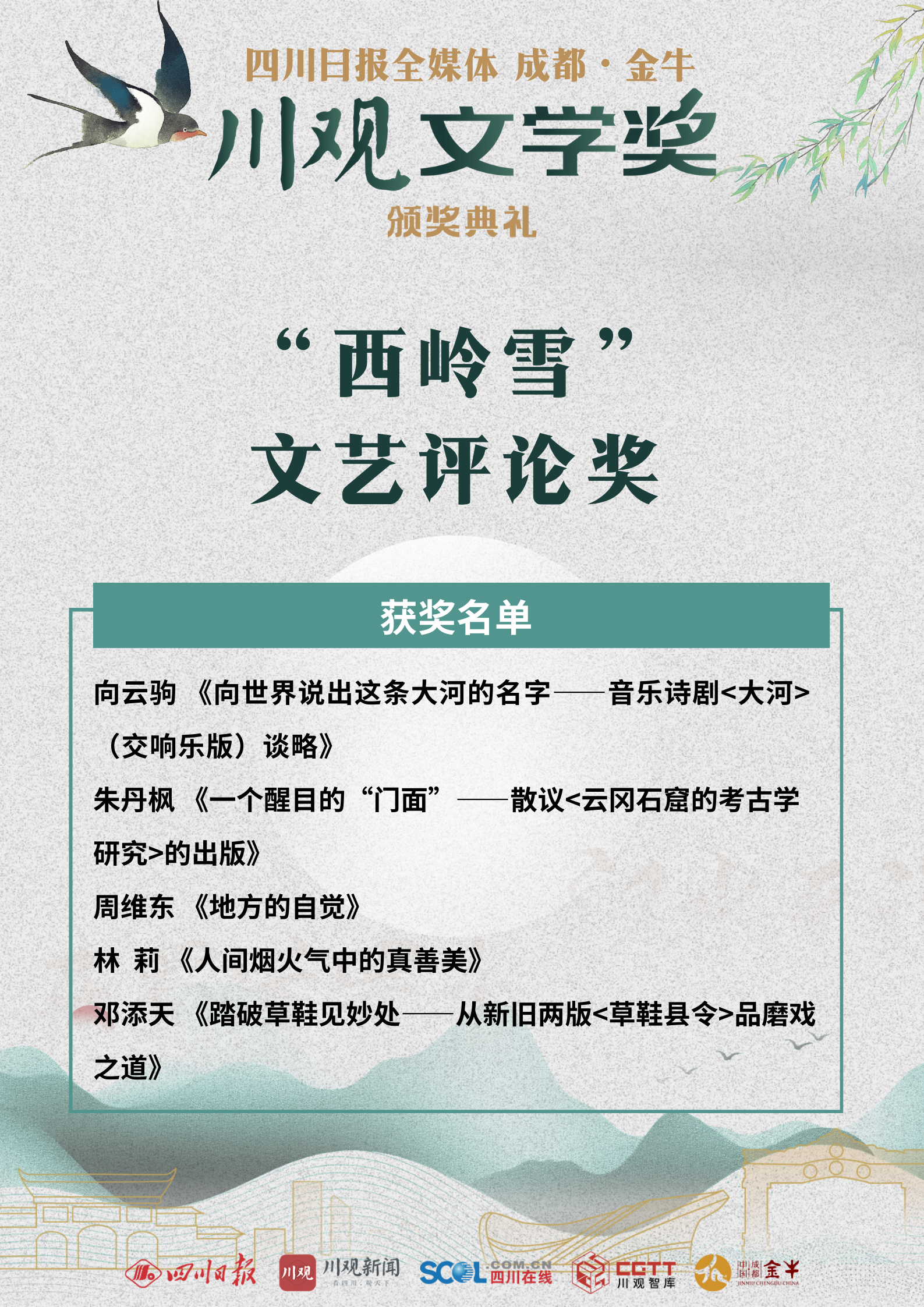 诗与音乐的相遇必然造就奇迹。我们这个古老民族的历史和心灵借由语言,被寄托在乐符之中。向云驹以中华文明史、世界文明史的开阔视野,以诗的方式走近音乐诗剧《大河》,感受和表达都“匹配”了原作的韵味,形成批评文体的独特建构。在有限的篇幅里,揭示问题意识和理论深度。有鉴于此,授予向云驹《向世界说出这条大河的名字——音乐诗剧〈大河〉(交响乐版)谈略》川观文学奖(2022年度)“西岭雪”文艺评论奖。
