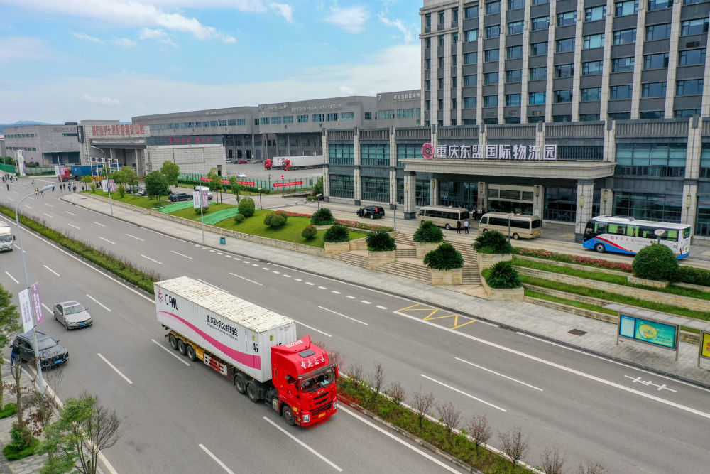 2023年10月11日,满载笔记本电脑配件、发电机组件等产品的西部陆海新通道跨境公路班车从重庆南彭公路保税物流中心驶出,将途经广西凭祥,直达越南(无人机照片)。新华社记者 黄伟 摄