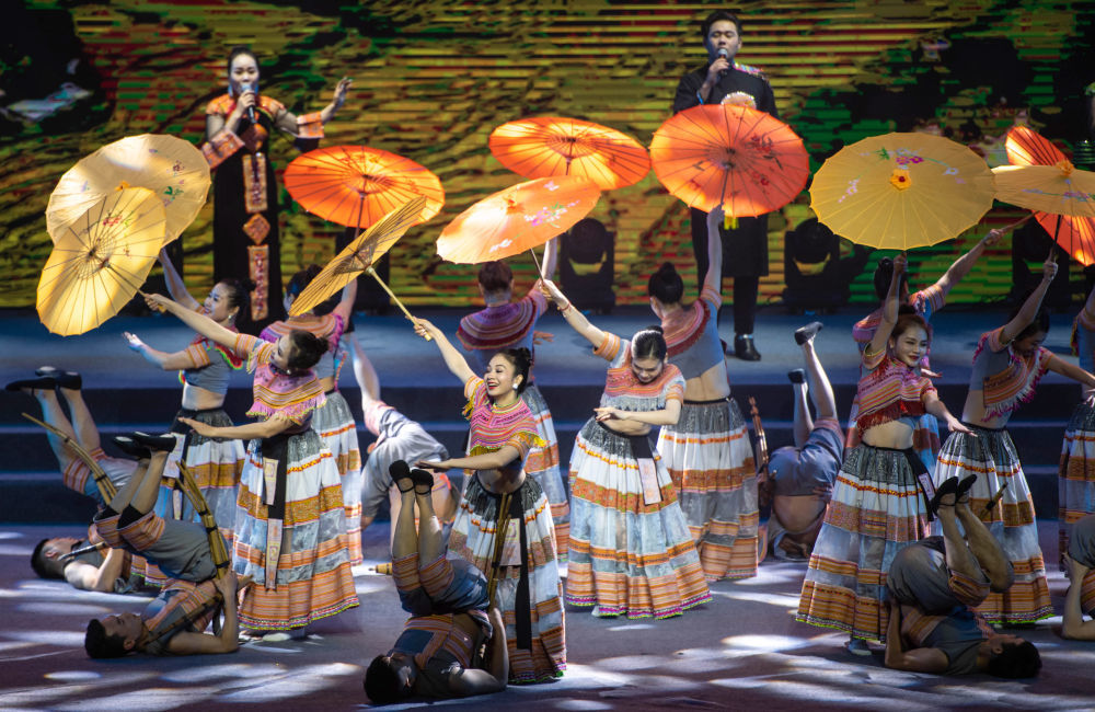 2023年1月18日,以“同心筑厚谊 携手共发展”为主题的2023年中越跨国春节联欢晚会在云南省红河哈尼族彝族自治州河口瑶族自治县举行,越南老街省民族艺术歌舞团的演员在晚会上表演歌舞《漂浮在云端的节日》。新华社记者 胡超 摄