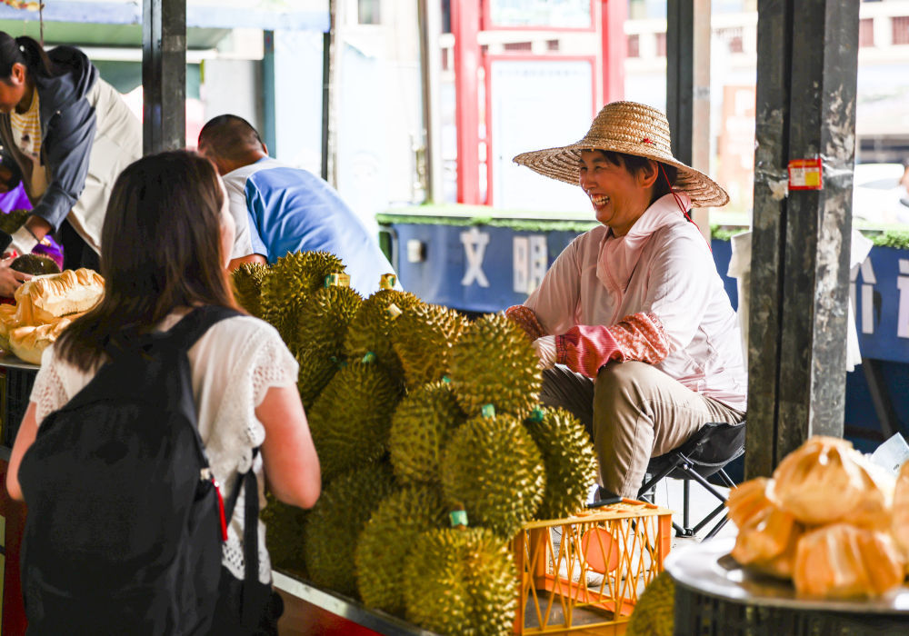 2023年5月18日,越南果商在广西东兴售卖榴莲。新华社记者 胡星宇 摄