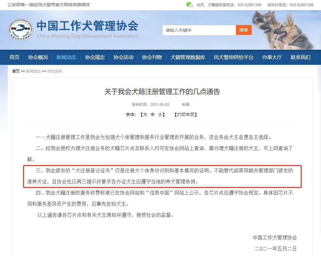 随后,记者在中国工作犬管理协会官网上,找到了一则2021年发布的《关于我会犬籍注册管理工作的几点通告》。