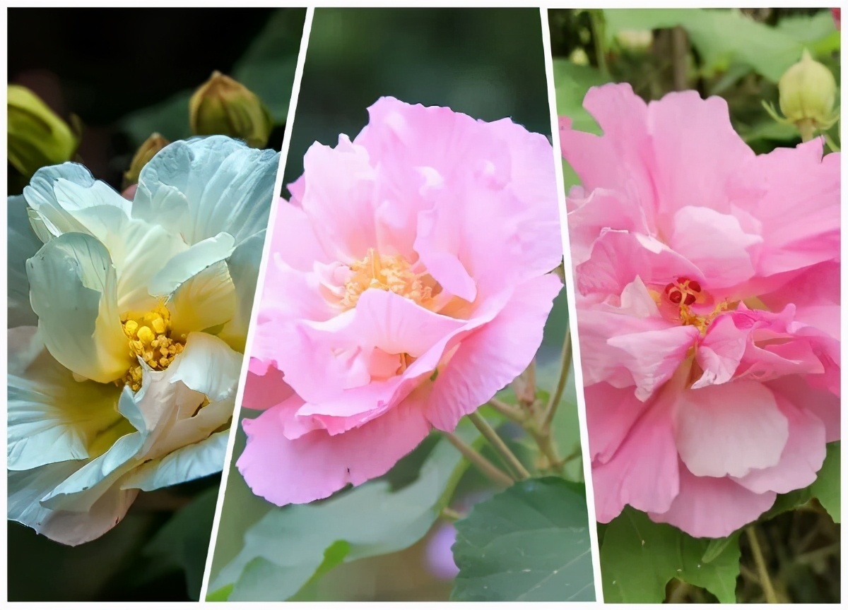 原来,有的芙蓉花在一天里有三种颜色啊,真像一位“捉摸不透”的姑娘。你看,渐变色的排列,是不是很美啊?这个花期,你有没有在圣灯·芙蓉谷里架起相机,记录下这关于生命的灵动呢?