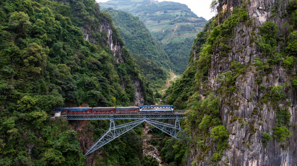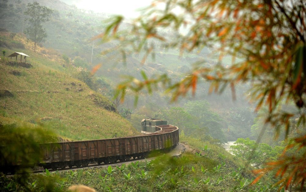 这是行驶在滇越铁路云南省屏边县境内的货运列车(2012年3月9日摄)。