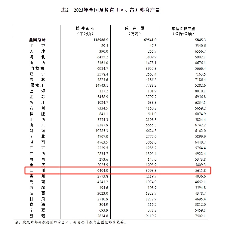 12月11日,国家统计局公布全国粮食产量数据,数据显示:2023年,四川全省粮食播种面积9606万亩,全省粮食总产量718.8亿斤,比2022年增长16.7亿斤,比最高历史年份2021年的716.4亿斤增长了2.4亿斤,再创历史新高。