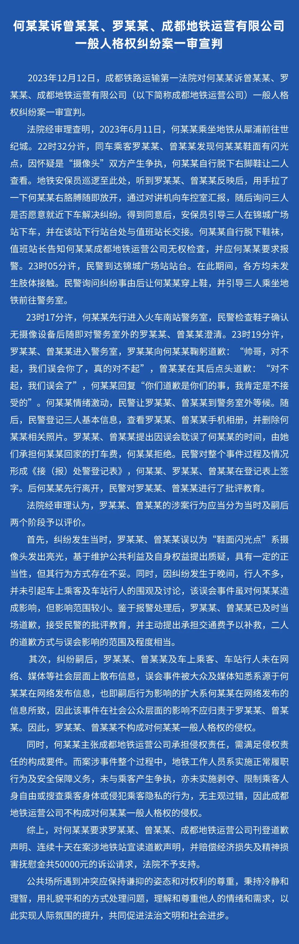 12月12日,记者从成都铁路运输第一法院获悉,备受关注的“成都地铁被诬陷偷拍事件”当事男子维权一案当日一审宣判。法院判决认为,两女子不构成对当事男子的一般人格权的侵权。对当事男子何某某要求罗某某、曾某某(两女子)、成都地铁运营公司刊登道歉声明、连续十天在案涉地铁站宣读道歉声明,并赔偿经济损失及精神损害抚慰金共50000元的诉讼请求,法院不予支持。