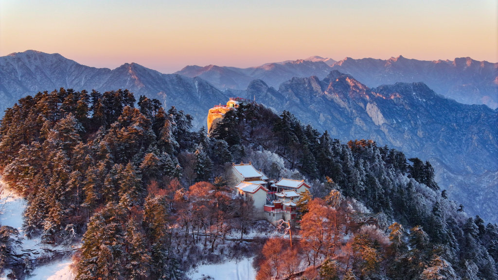 12月12日拍摄的雪后华山南峰和金天宫(无人机照片) 。