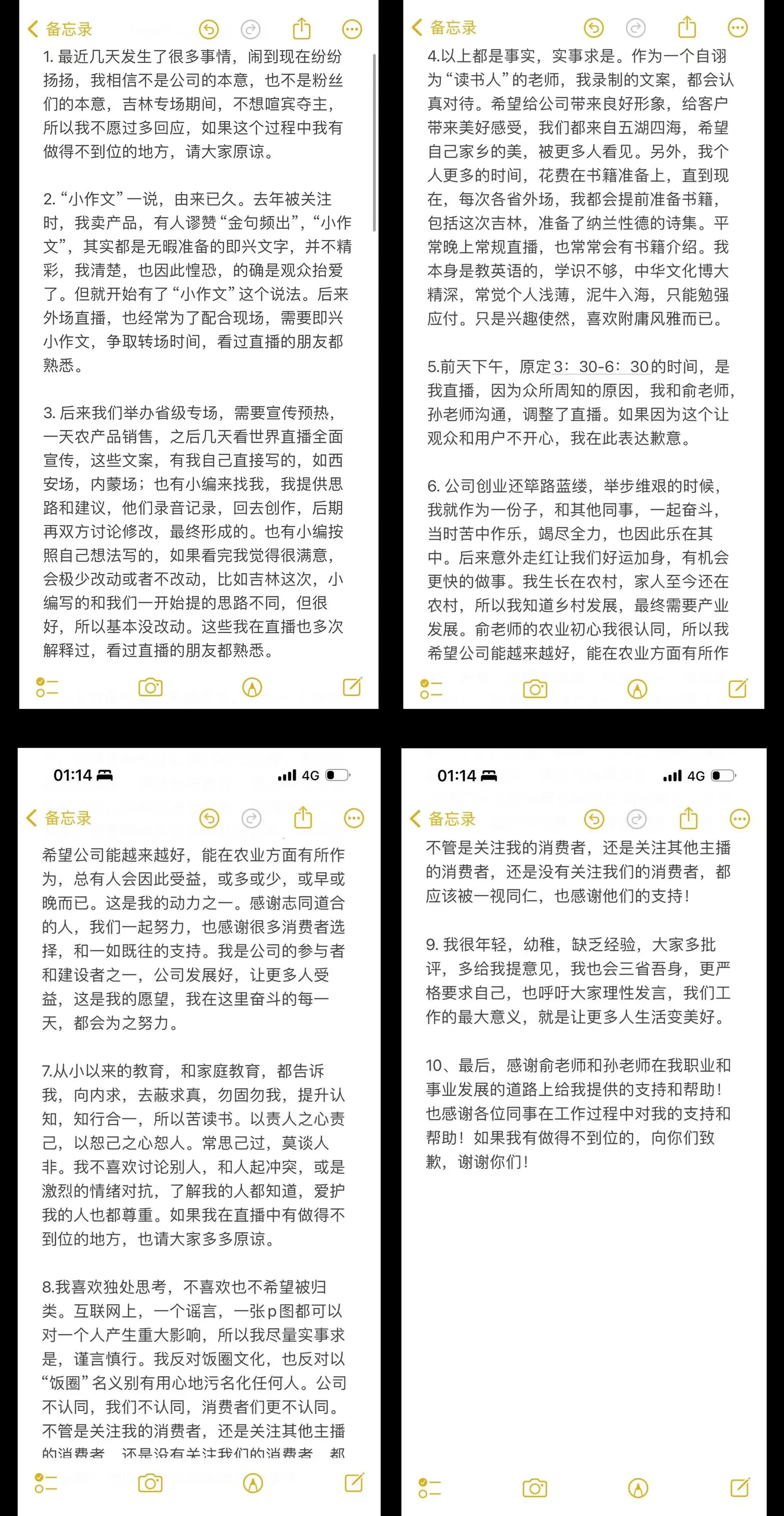 “所谓的‘小作文’其实都是无暇准备的即兴文字,并不精彩。”董宇辉表示,由于此前卖产品被夸赞金句频出,就有了“小作文”的说法,后来外场直播,也常为了配合现场,需要即兴小作文,争取转场时间,“最近几天发生了很多事,闹得纷纷扬扬,相信不是公司的本意,也不是粉丝的本意。”