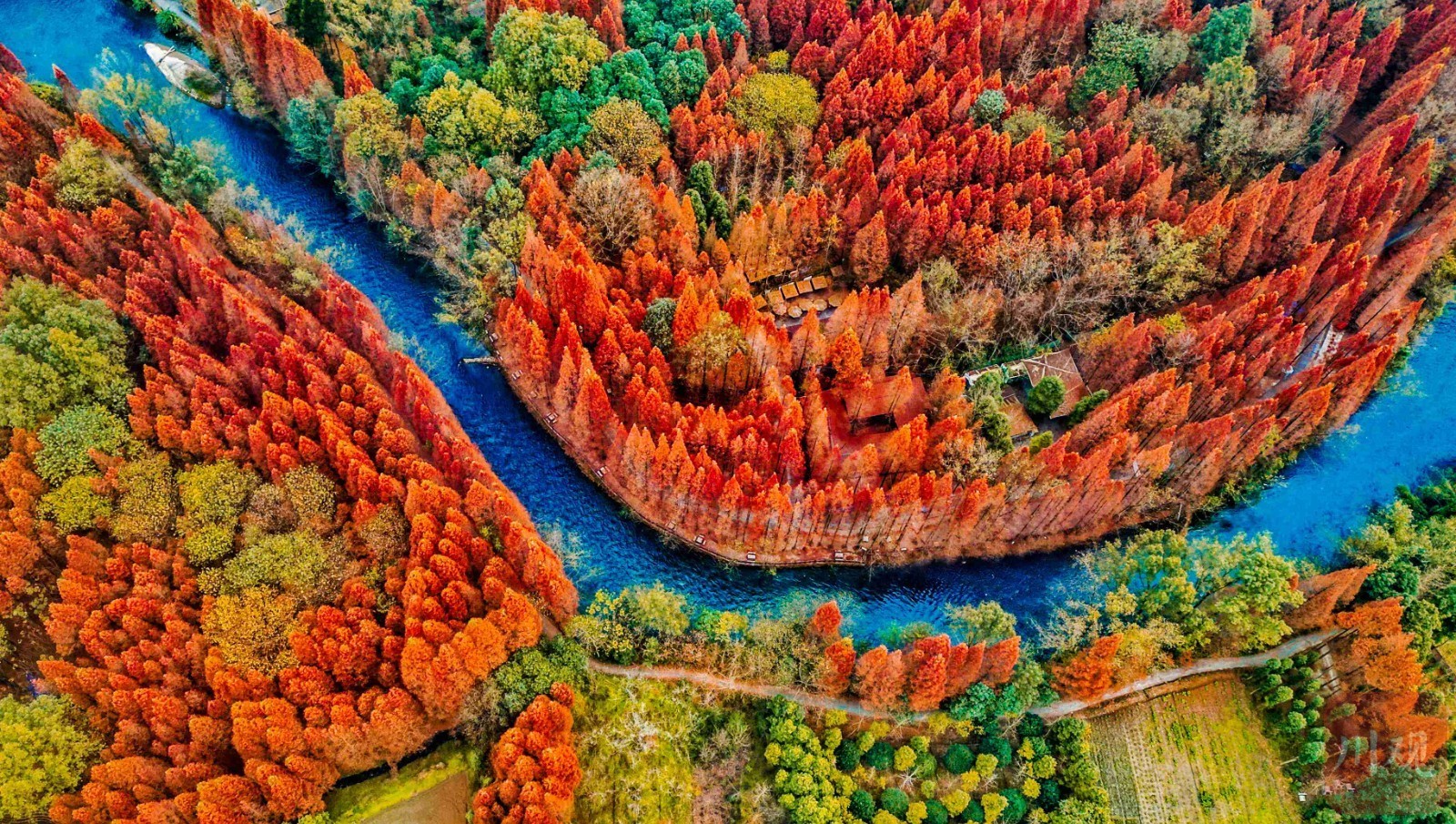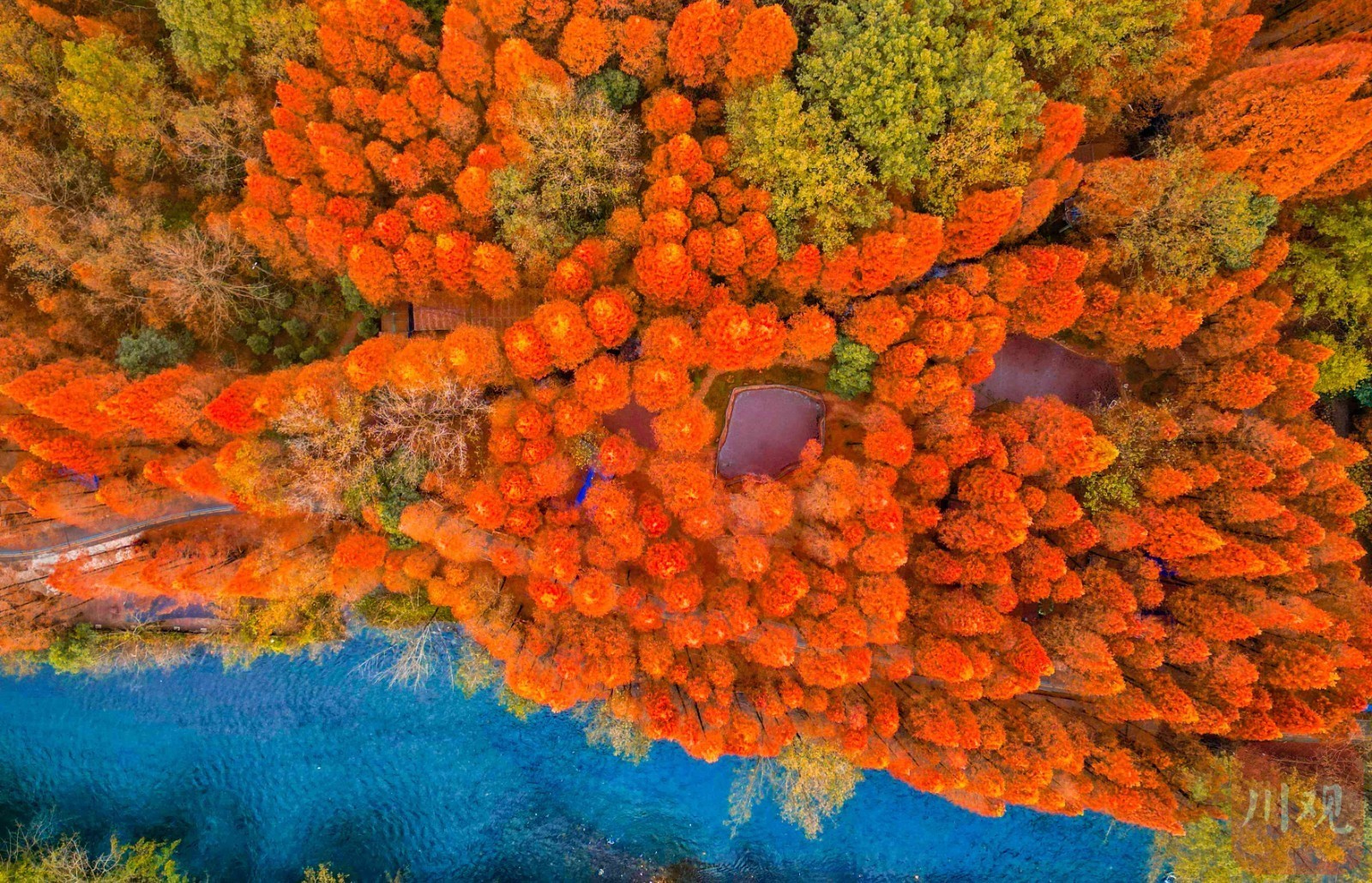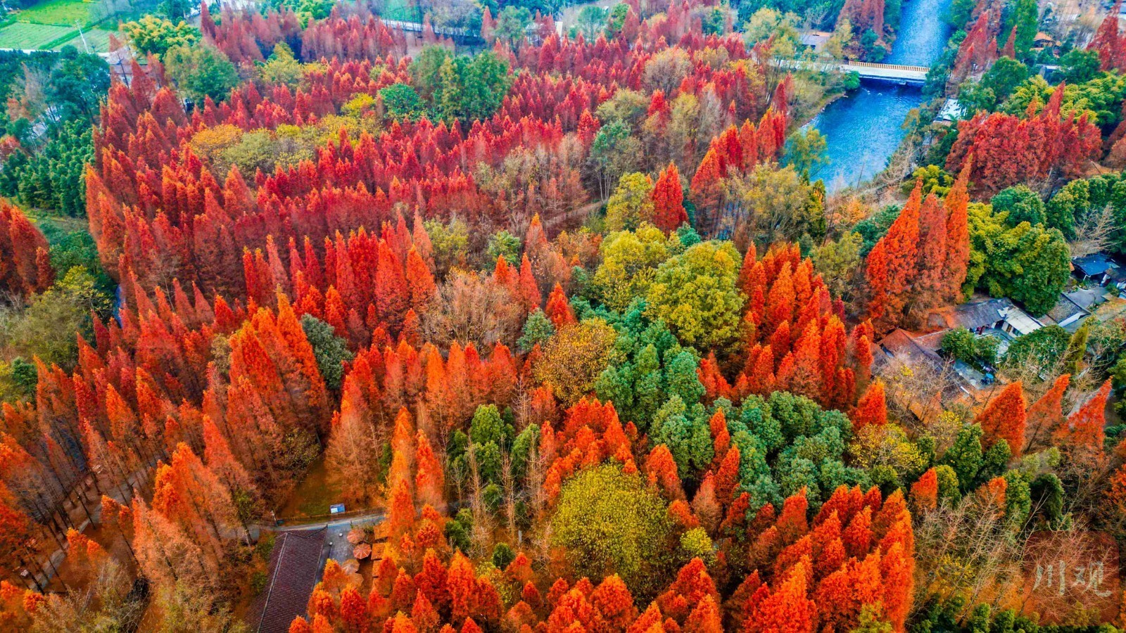 初冬,成都市都江堰朱家湾林盘披上了彩装。黑石河从朱家湾的林间穿过,河畔两岸水杉树变成了红色,与周围的植物红绿黄相间,大地像打翻的调色板一样色彩瑰丽,将川西乡村林盘的美景展露无遗。