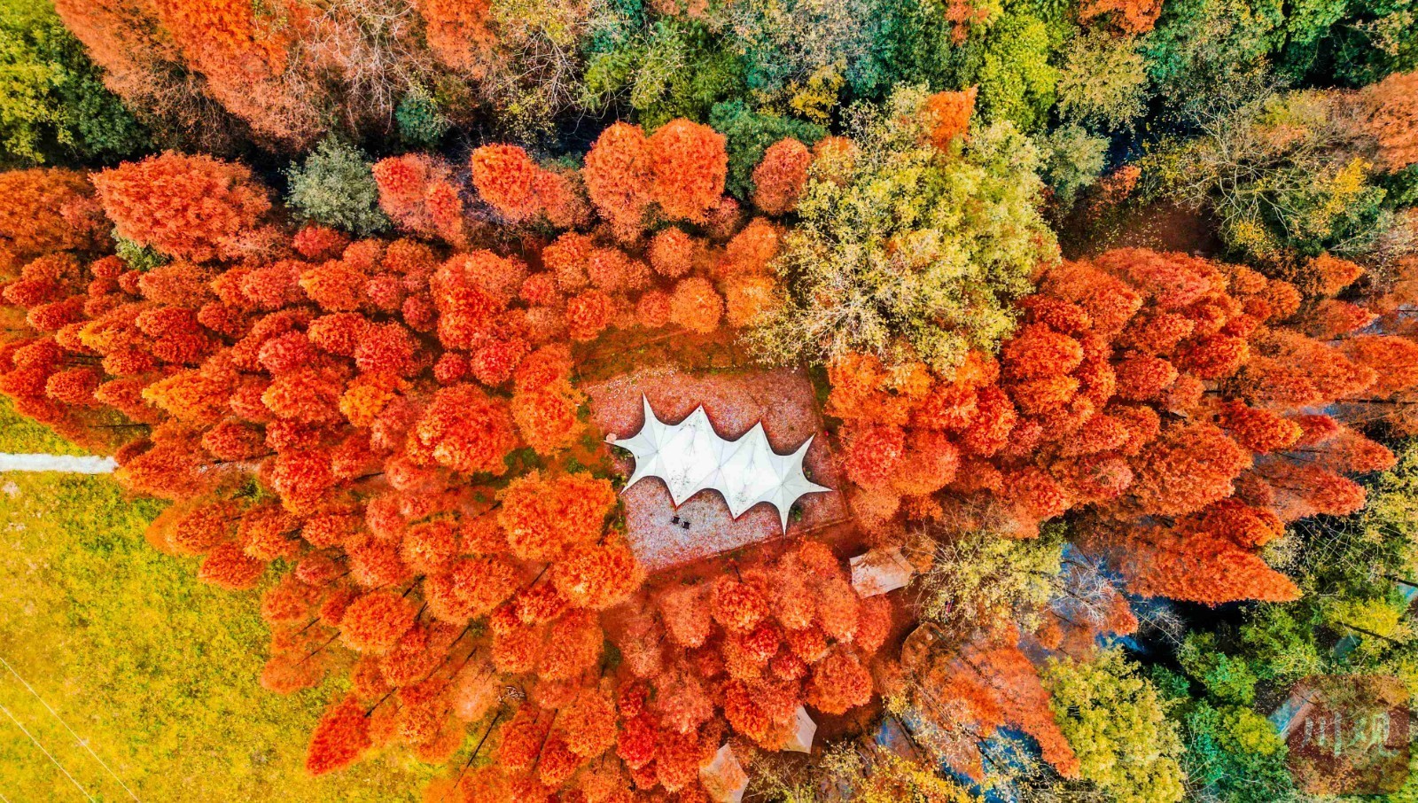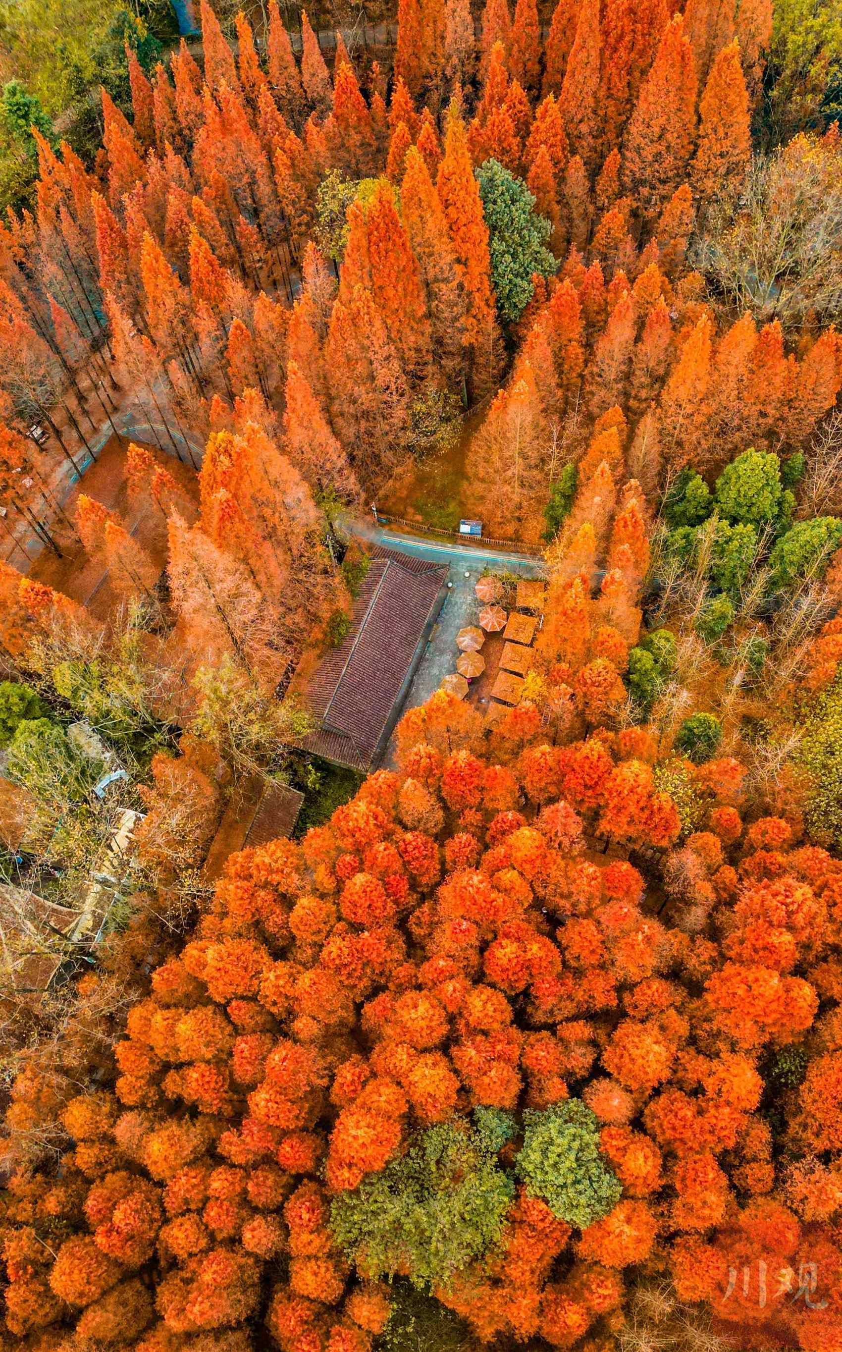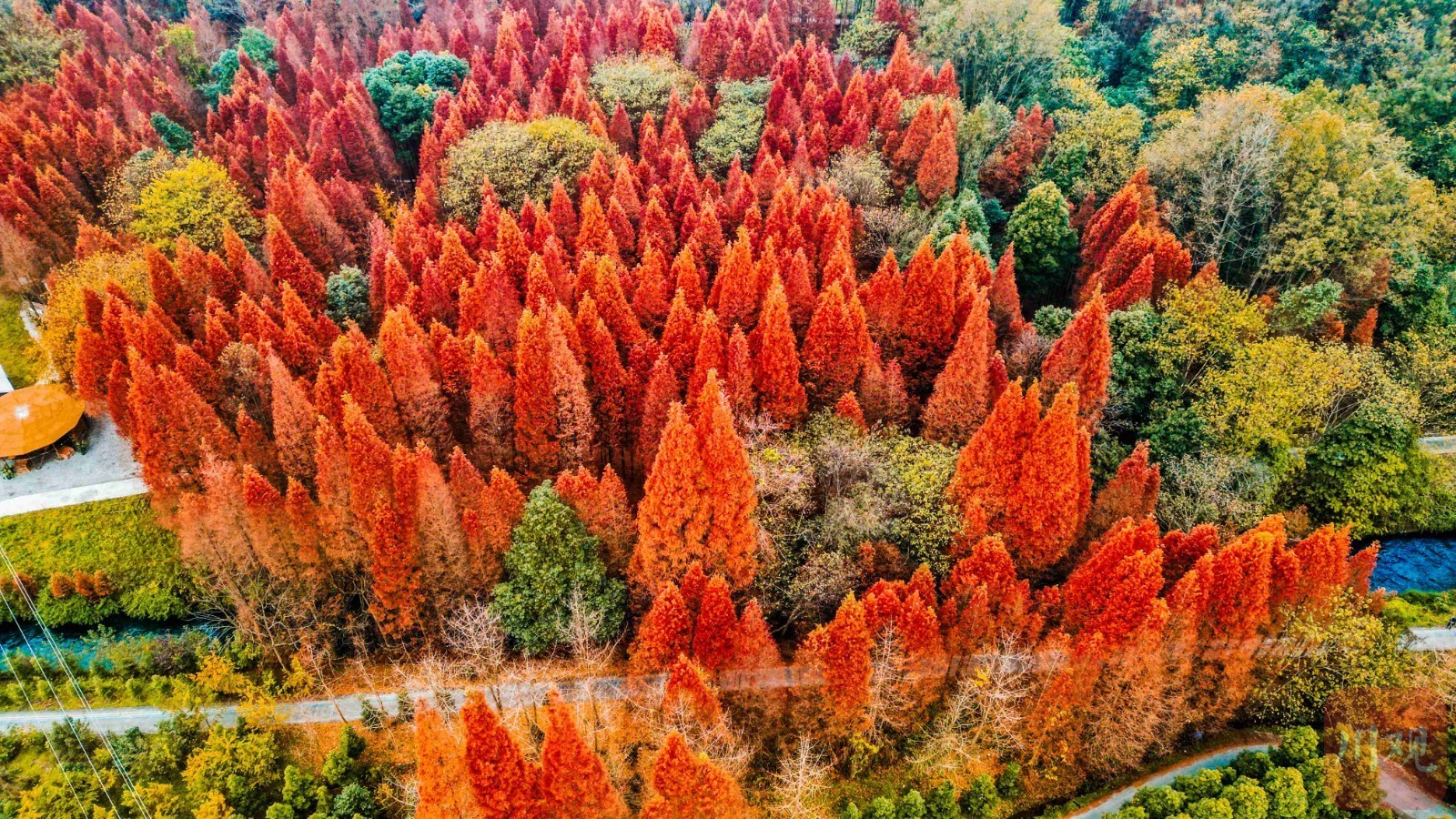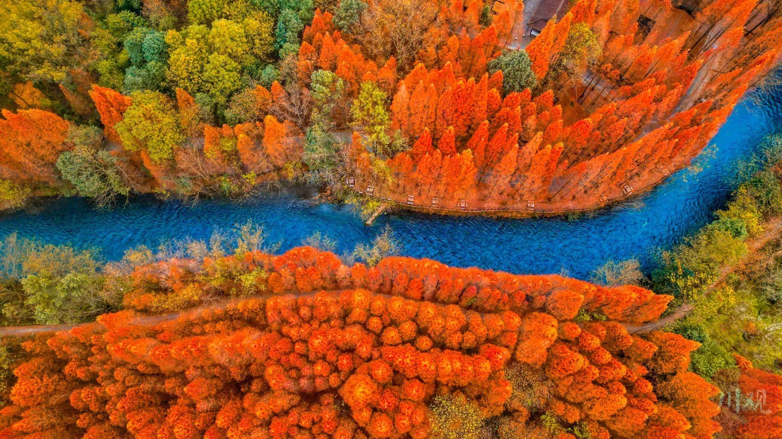 初冬,成都市都江堰朱家湾林盘披上了彩装。黑石河从朱家湾的林间穿过,河畔两岸水杉树变成了红色,与周围的植物红绿黄相间,大地像打翻的调色板一样色彩瑰丽,将川西乡村林盘的美景展露无遗。