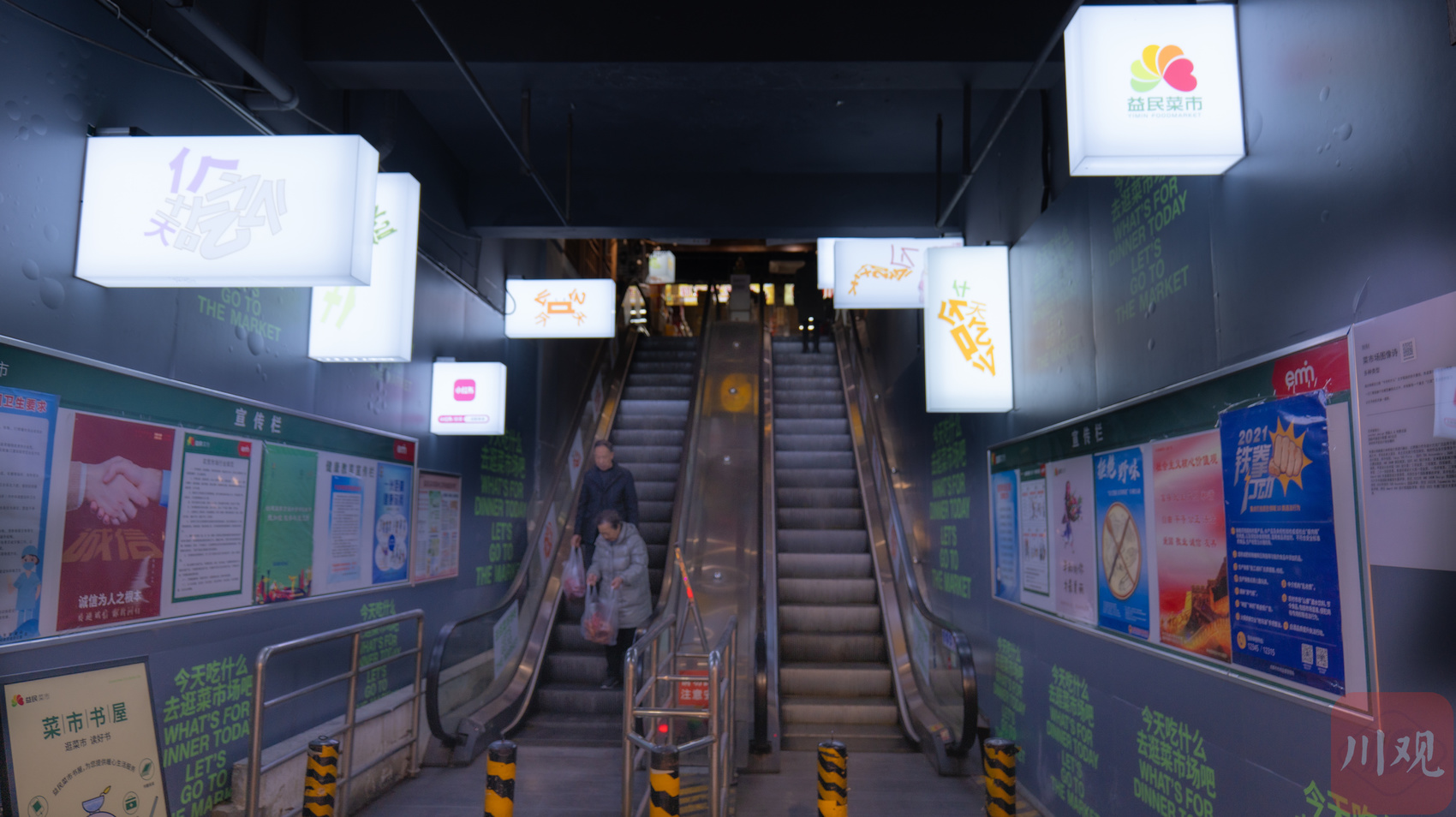 益民菜市长顺街店地处二楼,共有四个通往上行的交通空间。在展览期间,这些顾客出入菜市场的必经之路上安装了灯箱、霓虹灯等视觉装置,完成了与顾客的初步互动体验。