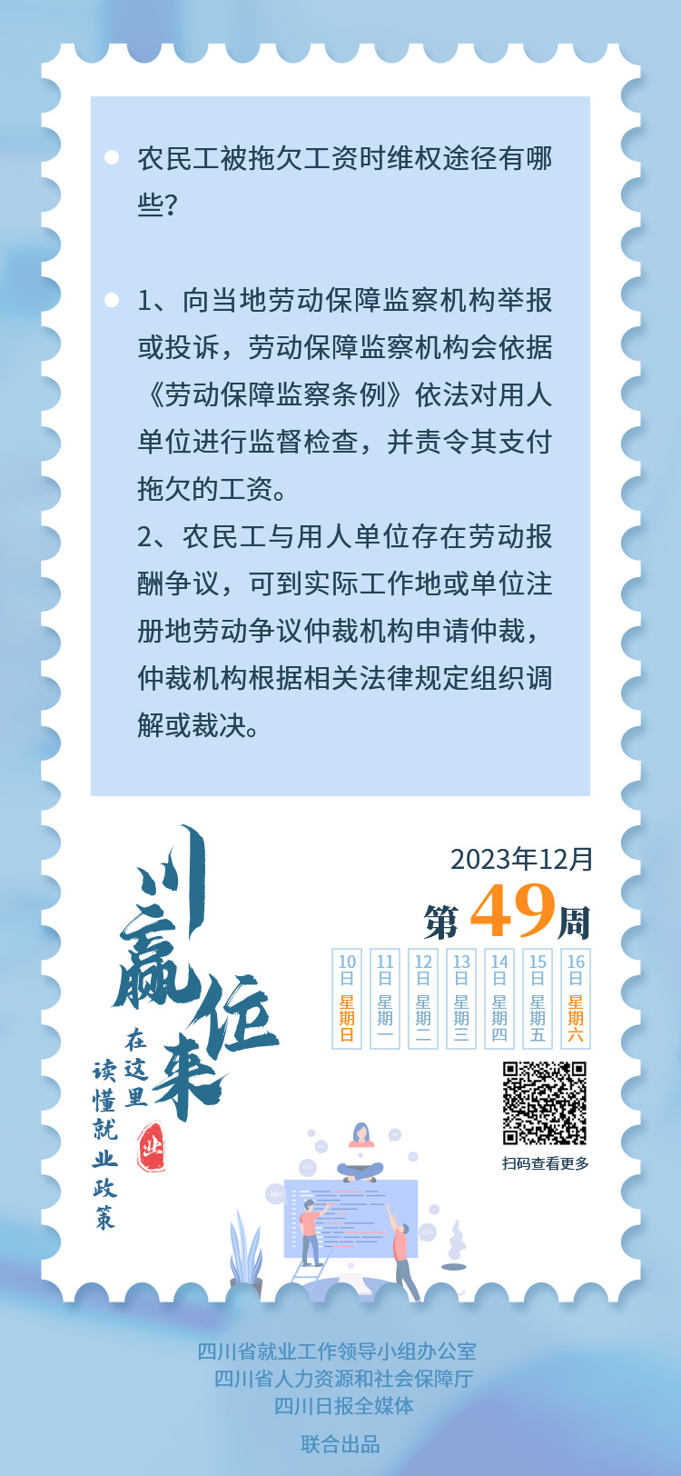 近日,四川省人民政府召开了全省根治欠薪工作暨冬季专项行动推进会,强调要坚决打好根治欠薪冬季攻坚战,切实维护农民工合法权益,让广大农民工安心、高兴回家过年。那么,万一农民工被拖欠工资了,应该如何依法维护呢?本期“川赢位来.就业政策周历”,就来聊一聊农民工被欠薪维权途径有哪些!