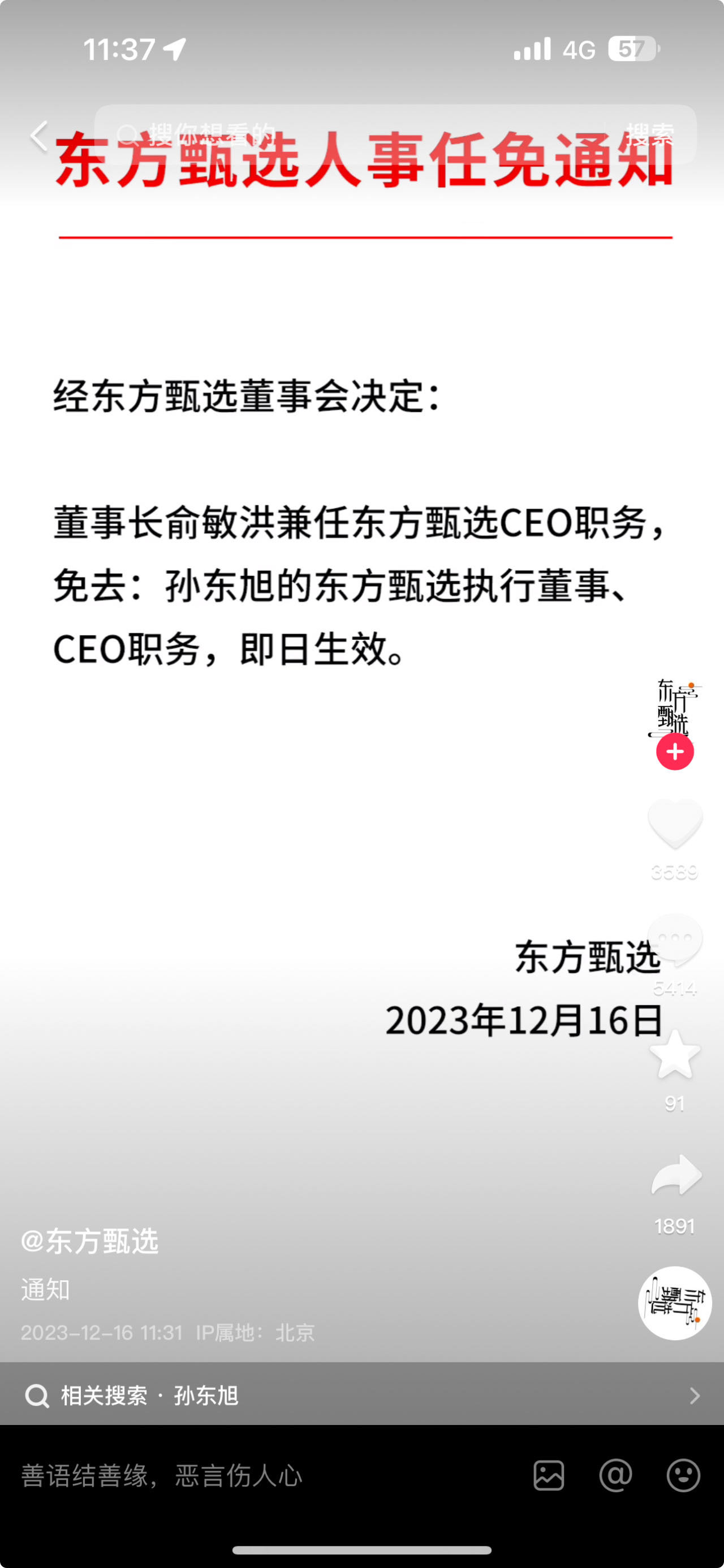 12月16日,东方甄选公告称免去孙东旭东方甄选执行董事、CEO职务,董事长俞敏洪兼任东方甄选CEO职务。