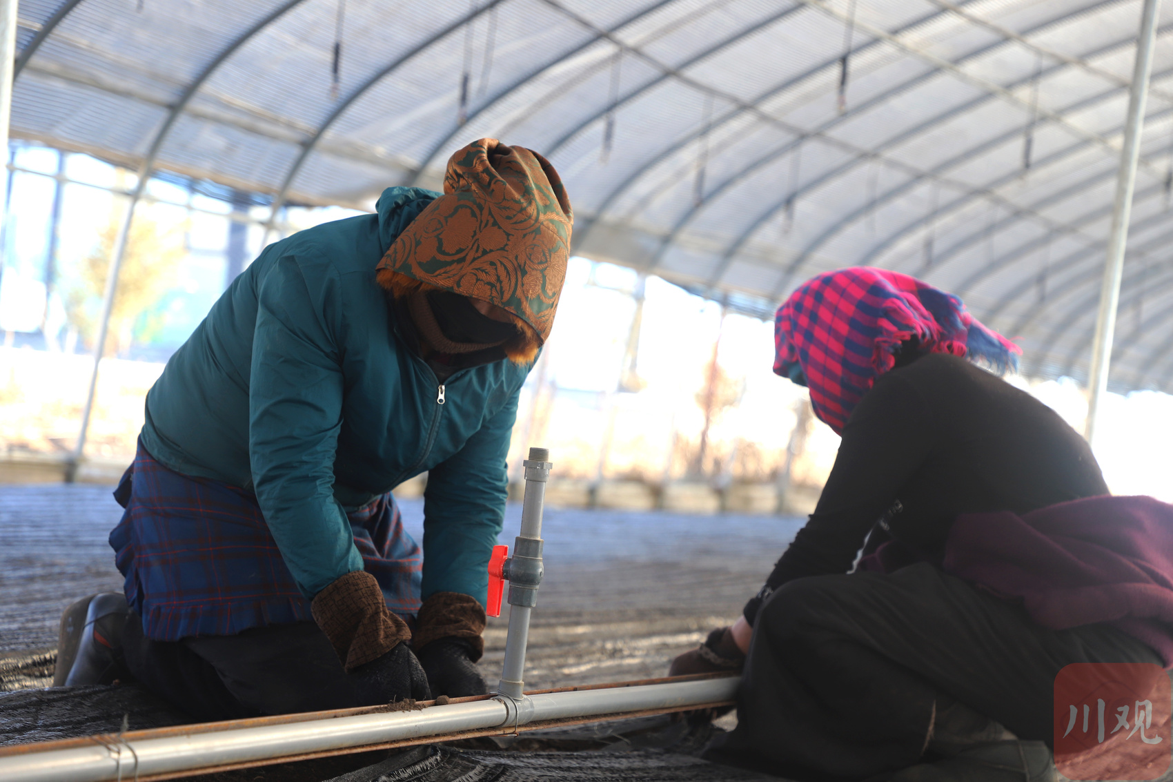 正说着,哈拉玛村村民贡迫便俯着身子,钻进了大棚,熟练地倒着粪灰。夏天她还来大棚里采挖贝母,是基地里的一名长期工。