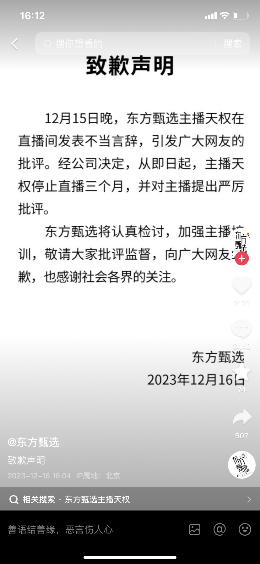 东方甄选直播间还发布致歉声明,主播天权停播三个月