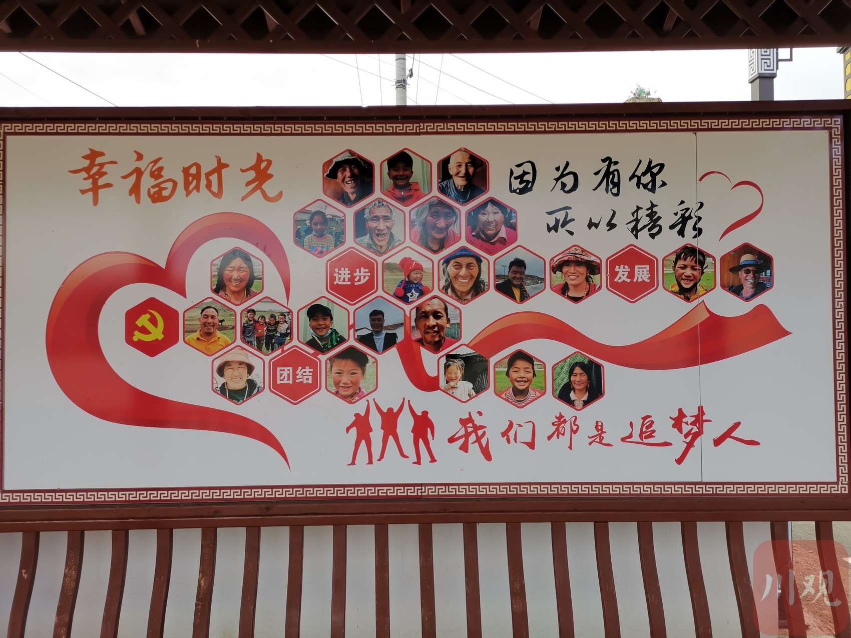 “团结、进步、发展”,三个关键词在党徽的引领下,将一张张充满幸福笑脸的照片串联起来,形成了一面主题为幸福时光的文化墙。12月16日,走进阿坝县贾洛镇日阿洛村党建主体广场,这幅充满笑脸和幸福感的文化墙格外扯人眼球。