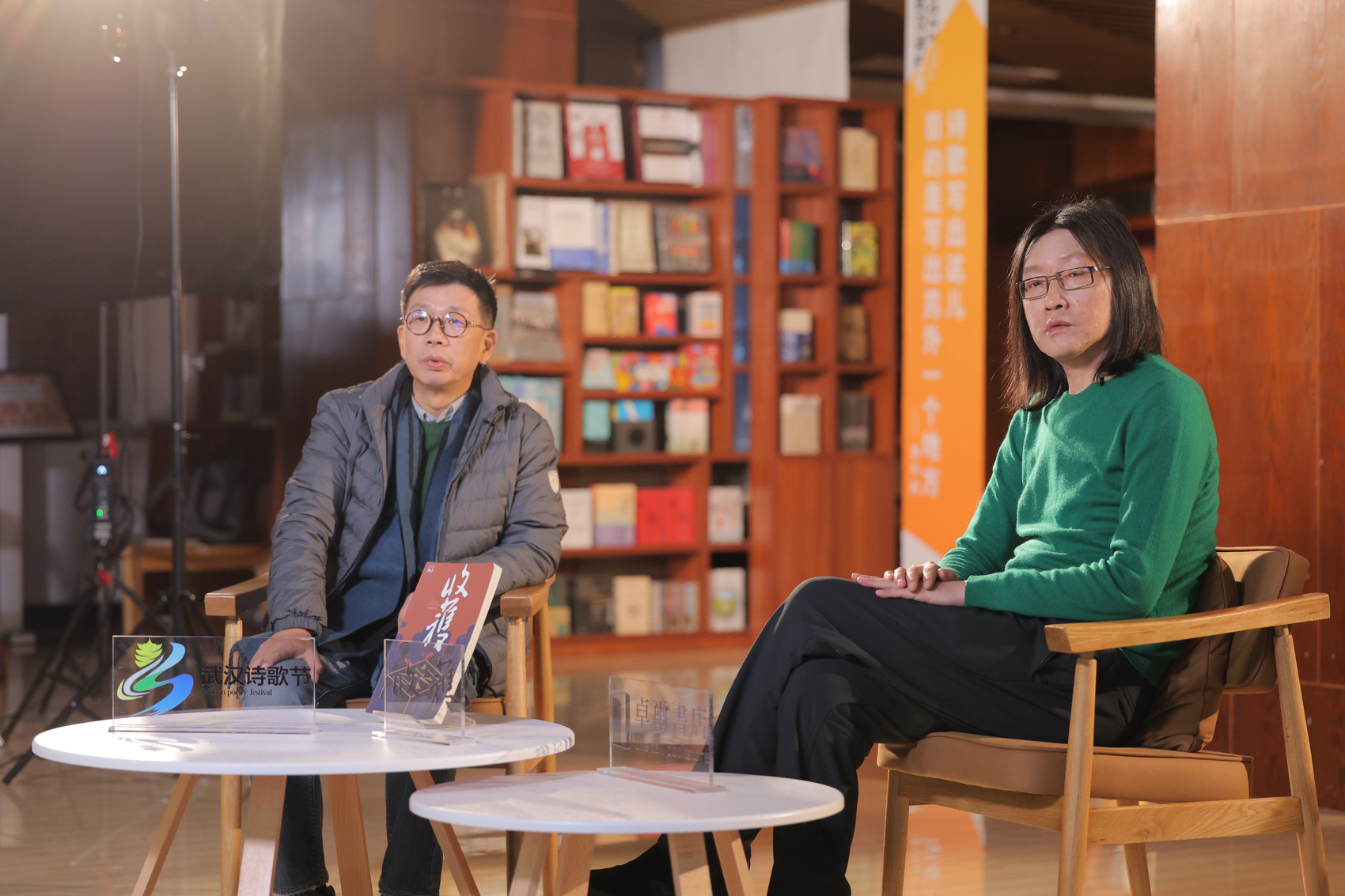 吉狄马加和耿占春作为第一组诗人率先上台,“那是谁的马车从那边跑过,/在黑暗的深处它的轮子发出空寂的声音。”为什么会选择《时间之外的马车》?诗人回答:时间对所有的哲学家和诗人都是一个命题,诗歌和音乐是可以穿越时间的,“马车”是自己的想象之物,能够揭示时间之中的未知存在之物。耿占春分享的则是吉狄马加的诗歌《如果我死了……》,“如果我死了/把我送回有着群山的故土”,死亡一向是诗歌写作的重要主题之一,它不是生命的终结,吉狄马加创作有关死亡主题的诗歌时,总是会有一种赞歌的声音在里面,同时也是一种回归的要素,吉狄马加写过很多有关这一主题的诗歌。