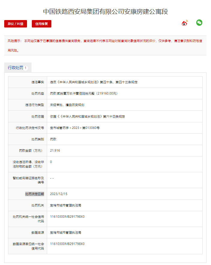 根据“信用中国(陕西)”网站发布的《宝市城管罚字〔2023〕第013060号》显示,中国铁路西安局集团有限公司安康房建公寓段未经审批、擅自改变规划,违反了《中华人民共和国城乡规划法》第四十条、第四十三条规定。