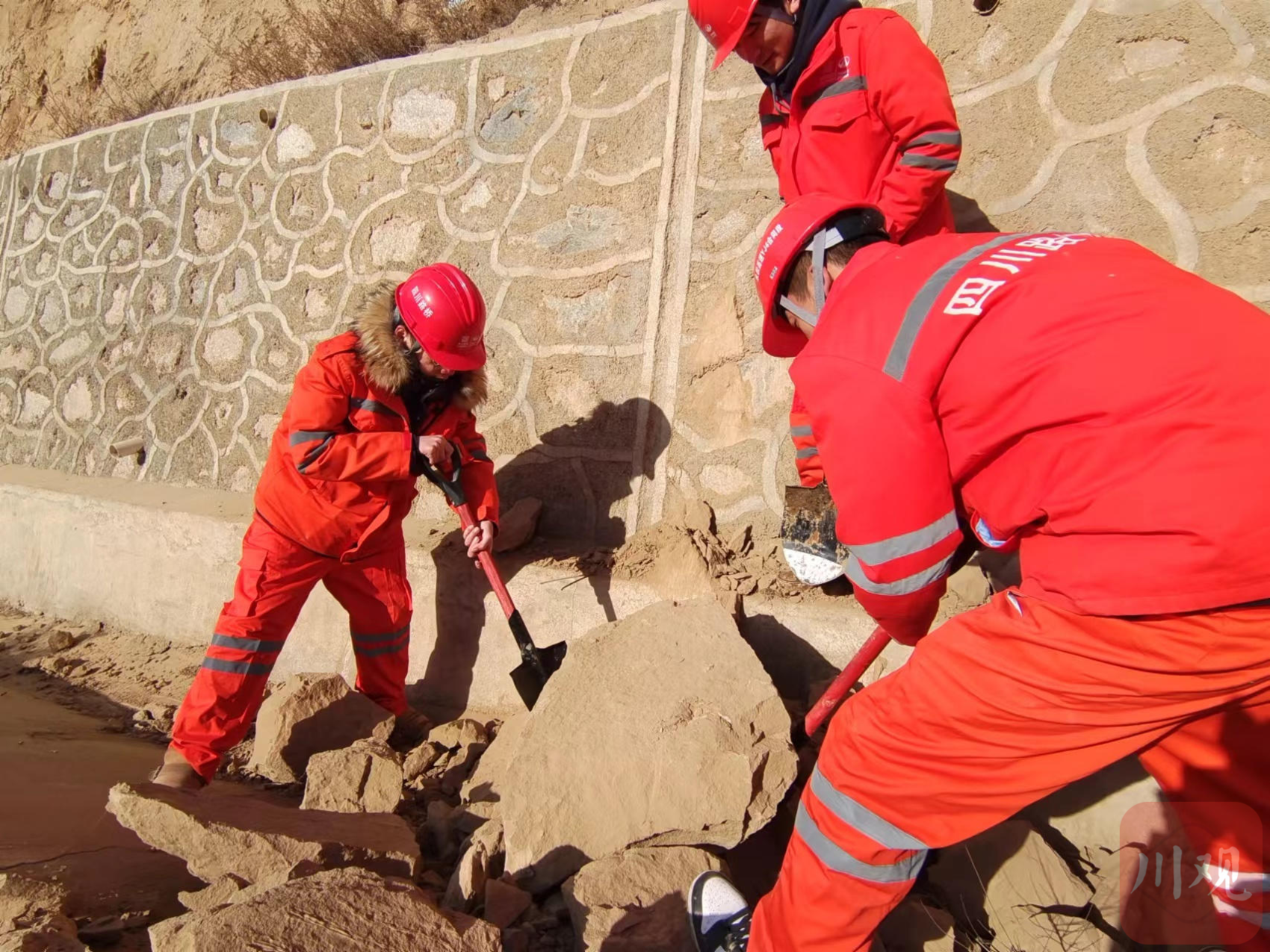 在积石山县安集镇三坪村清除机械无法清理的落石。