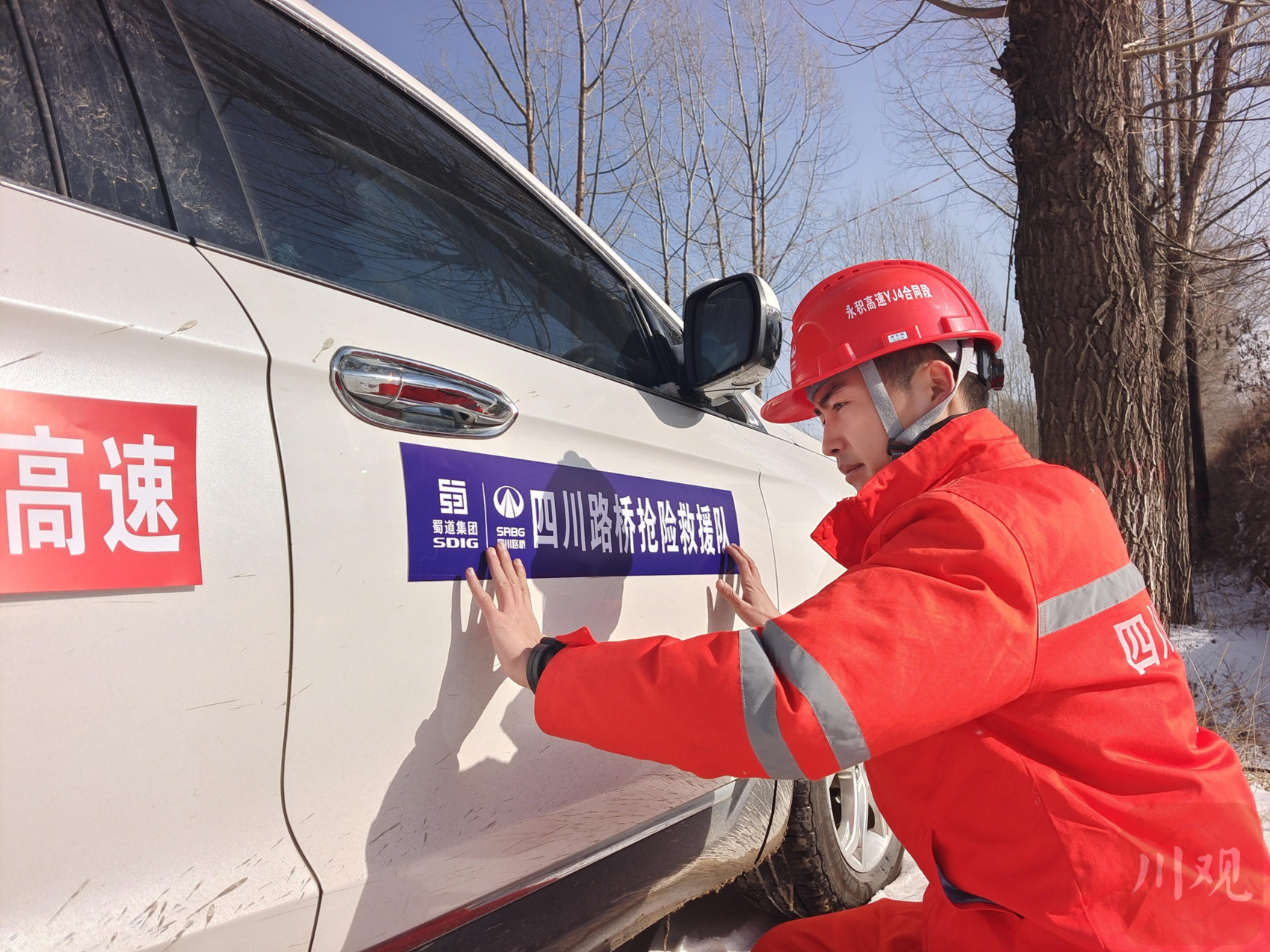 在救援车辆上张贴救援标识方便前往灾区参与救援。