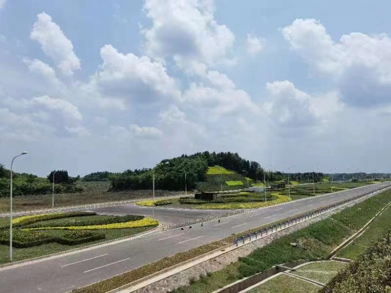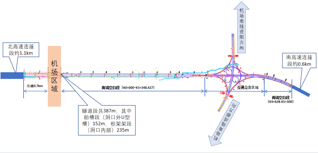 空港大道二期工程(含隧道段)位于成都东部新区草池镇、芦葭镇,路面段由北端和南端两部分组成,全长约6.4公里,其中北端段全长0.7公里(已于2021年通车),南端段全长约5.7公里,(含互通立交1座),隧道段全长约3.3公里,道路宽80米,设计速度80km/h。