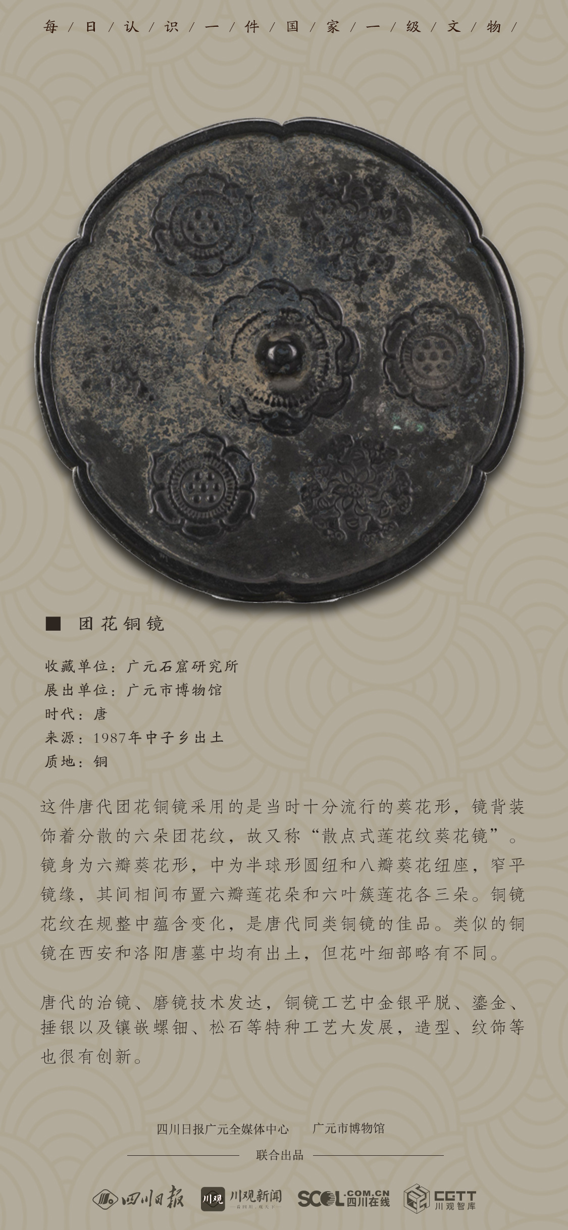 唐代的治镜、磨镜技术发达,铜镜工艺中金银平脱、鎏金、捶银以及镶嵌螺钿、松石等特种工艺大发展,造型、纹饰等也很有创新。这件铜镜收藏单位为广元石窟研究所,目前在广元市博物馆进行展览。