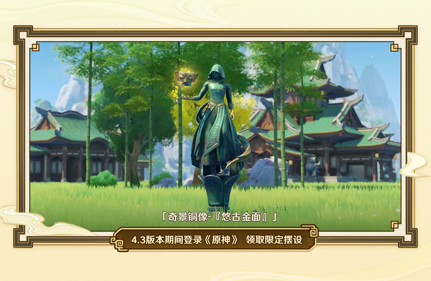 在《原神》游戏之内,结合三星堆青铜器风格所设计的限定摆设——奇景铜像“悠古金面”,将提供给全球的《原神》玩家。这款铜像以游戏角色钟离为形,手持华贵金面,金面型制肃穆轩昂,纹饰璀璨夺目。此外,《原神》当天还发布了由知名配音演员彭博演绎的创意文物解说《古物见闻》、文物科普互动H5《开山览物》。玩家们可以在游戏角色钟离细致的讲解和交互体验中,了解三星堆文明和文物背后的知识与细节。