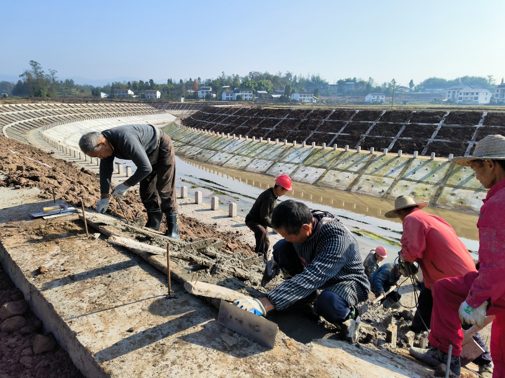 在墩子河大树镇东照社区段防洪治理工程现场,数十名工人正进行框格梁面板搭建以及填土等工序。此次治理工程涉及河道综合治理长度5.18公里新建左右护岸共4.05公里,河道清淤、疏浚共3.07公里。