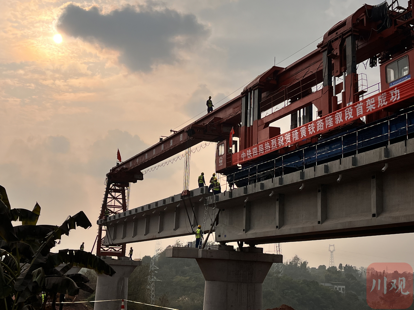 中铁四局隆黄铁路隆叙段铺架项目经理朱家坤介绍,目前全线采用边铺架边架梁的施工方式,今天铺架启动后,每天架道的进度将在每天2—3孔,确保如期完成施工任务。此外,此次铺架面临营业线交叉施工,作业繁杂;跨越长江、沱江等重要水域,环水保管控措施严;多处穿越高速公路,协调难度大等诸多困难。为保障铺架工程顺利进行,项目参建各方积极优化施工组织,充分结合线路特点,利用群吊技术、专业化信息调度指挥系统,合理调配架桥机、龙门吊、平板车等施工设备,确保安全、优质、高效、科学推进施工任务。