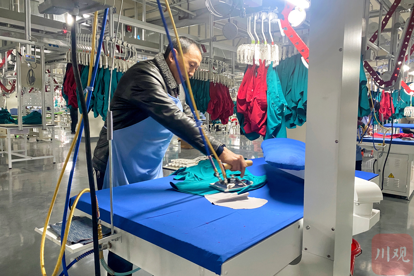 12月21日,在广安经开区前锋园区双创中心的广安沐琳制衣有限公司车间内,从五楼到二楼,红色、蓝色布料经裁剪分割后,沿着智能吊挂系统送到相应工位,经过裁剪、压标、缝制、整烫等多个工序,一条条运动短裤制作而成。这个车间从签约到投产,仅用时4个月。