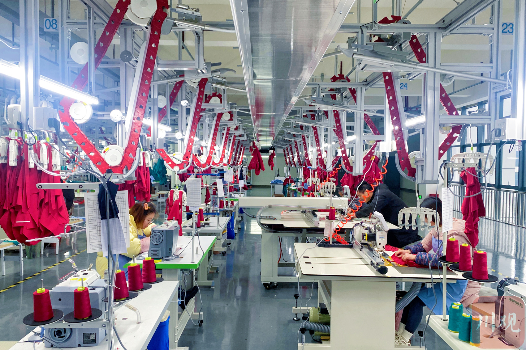 红色、蓝色布料沿着智能吊挂系统被送到相应岗位。