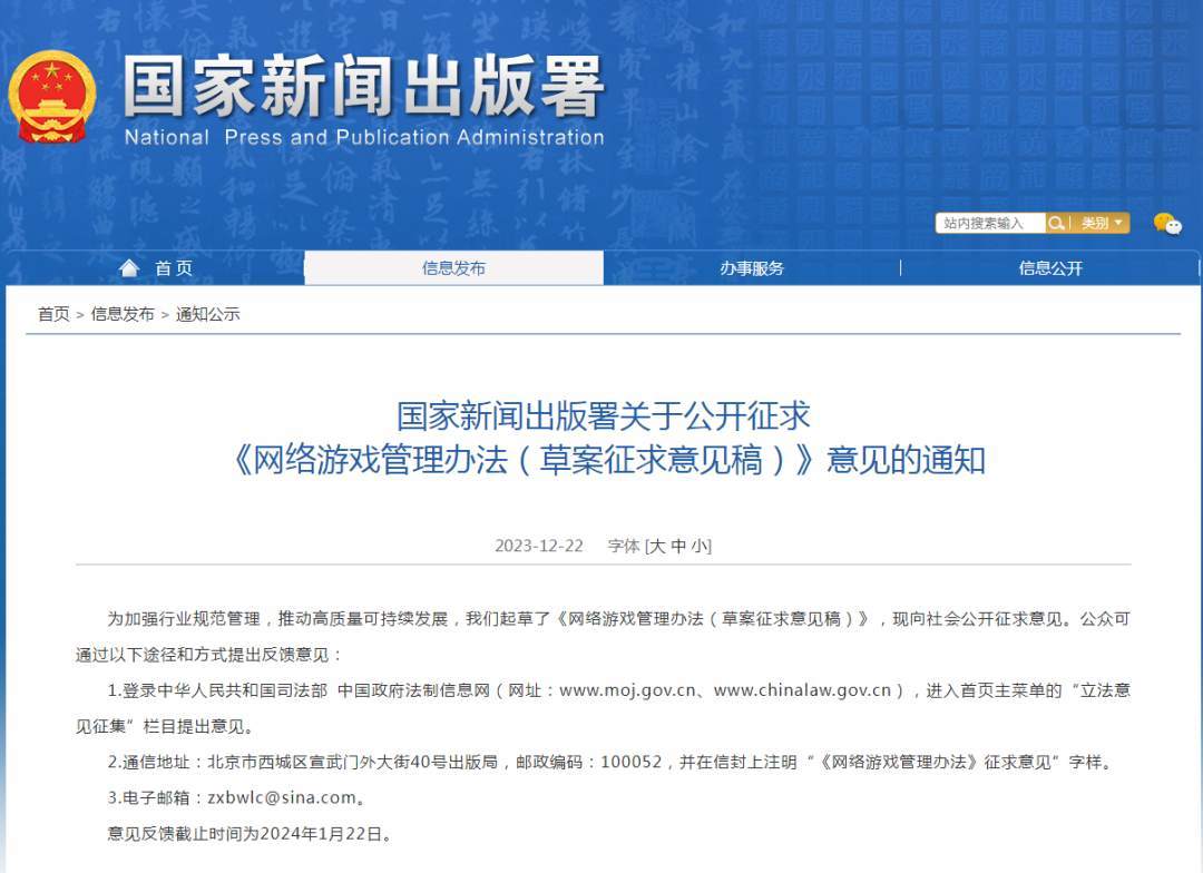 12月22日,国家新闻出版署发布关于公开征求《网络游戏管理办法(草案征求意见稿)》意见的通知,其中提到:网络游戏不得设置每日登录、首次充值、连续充值等诱导性奖励。网络游戏出版经营单位不得以炒作、拍卖等形式提供或纵容虚拟道具高价交易行为。所有网络游戏须设置用户充值限额,并在其服务规则中予以公示,对用户非理性消费行为,应进行弹窗警示提醒。