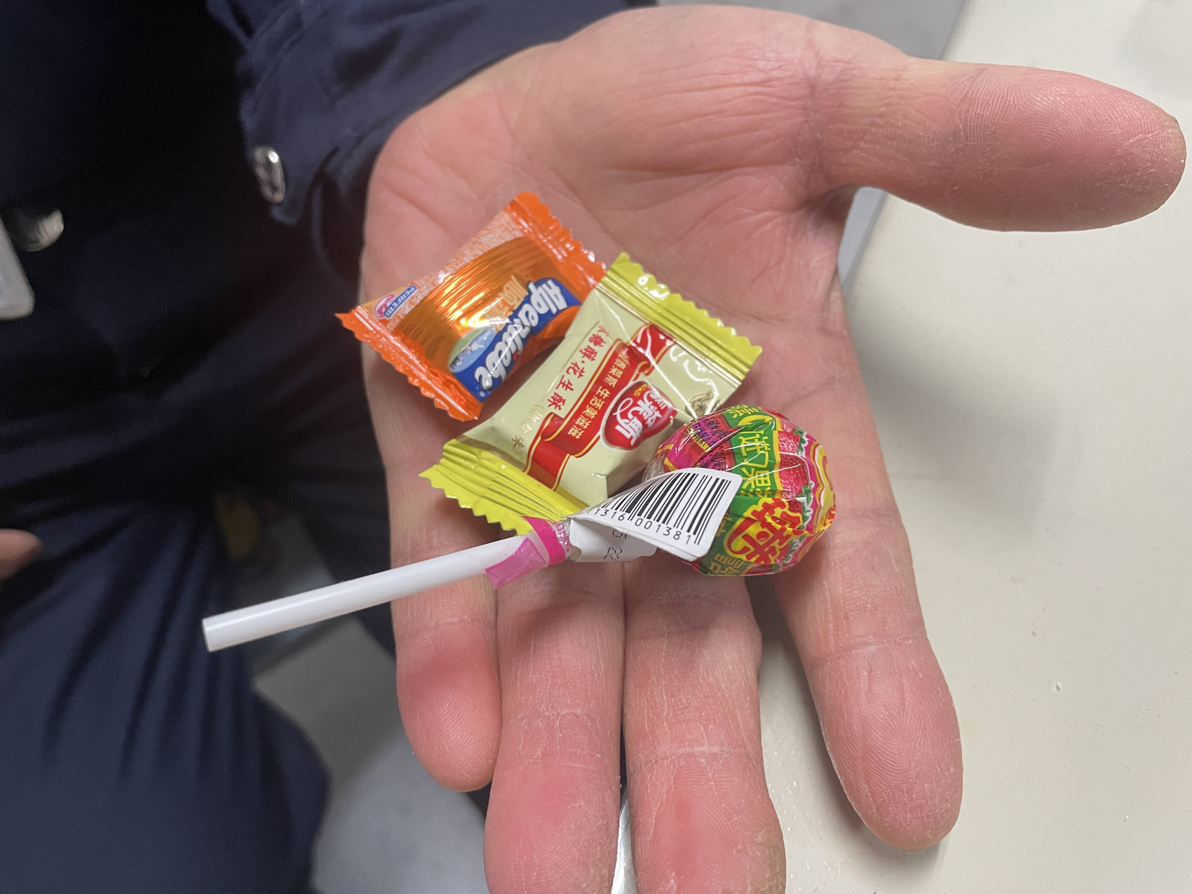 对于张师傅来说,随身带糖不是因为爱吃糖,而是他工作准备的一部分。在他工作服左边口袋里,长期都装着几颗糖果。“二月份调到华西坝站之后,我发现这边到医院看病的乘客很多,经常有低血糖晕倒的人。所以就养成每天带点糖在身上的习惯。”张师傅摊开厚实的手掌,今天他带了四颗糖,上午给了一位低血糖乘客一颗,现在还剩三颗——一颗草莓味棒棒糖、一颗花生糖、一颗香橙味牛奶糖。