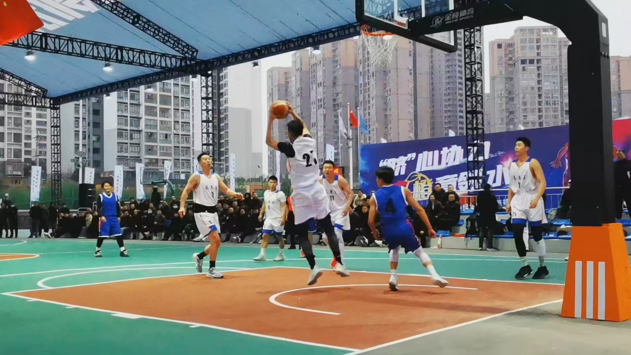 图为“脐”心协力·“邻水金融杯”明月山篮球邀请赛四川省大竹县对阵重庆市长寿区比赛现场。