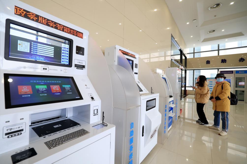 在河北省正定县政务服务大厅,群众利用政务服务便民自助终端机办理业务。(梁子栋 摄)