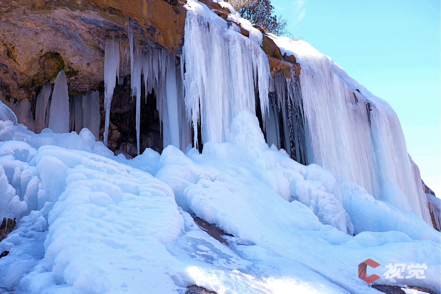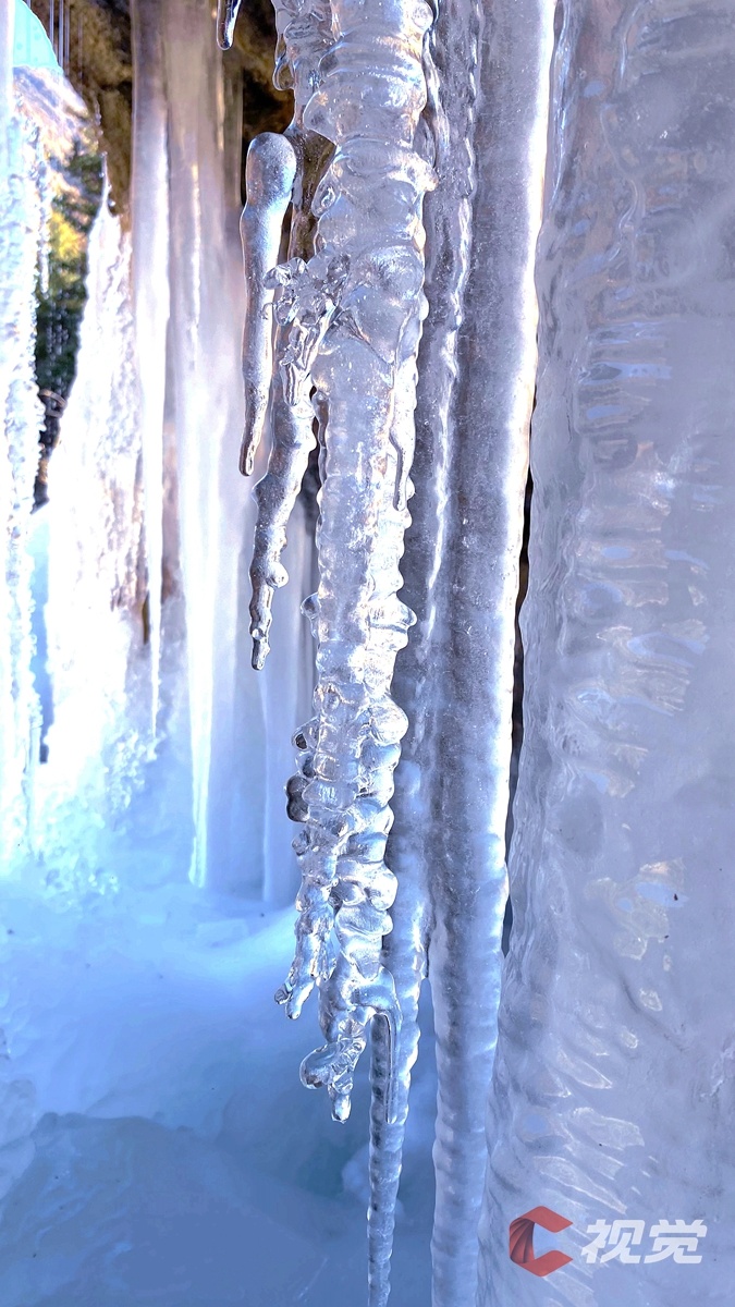 走近一些才发现,冰瀑布后面已形成一个冰洞,洞内被冰层覆盖,形成了不少冰柱、冰锥。这些大自然“雕刻”的艺术品,如同形态各异的水晶装饰一般耀眼。