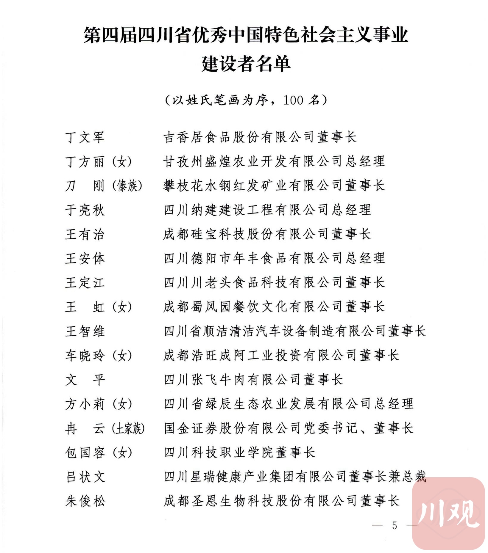 《决定》指出,为表彰先进、宣树典型,经省委、省政府同意,省委统战部、经济和信息化厅等单位联合表彰丁文军等100名第四届四川省优秀中国特色社会主义事业建设者,授予“四川省优秀中国特色社会主义事业建设者”称号。