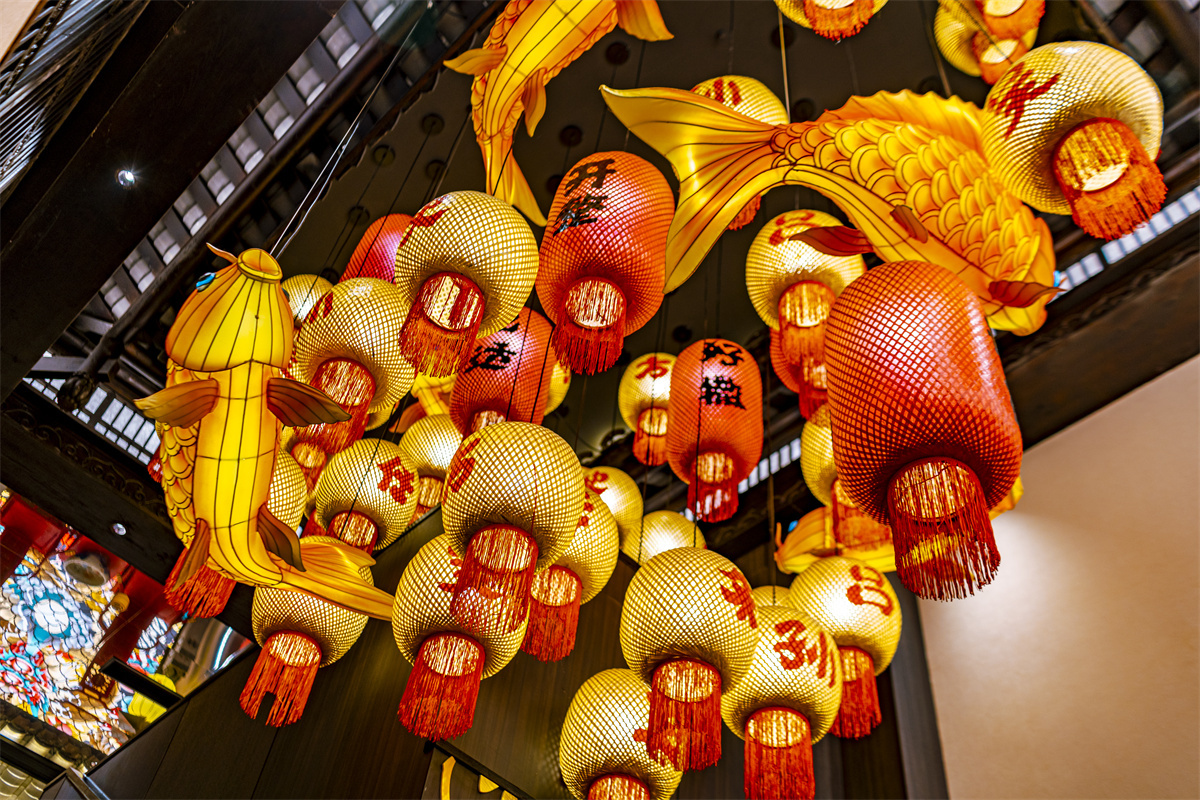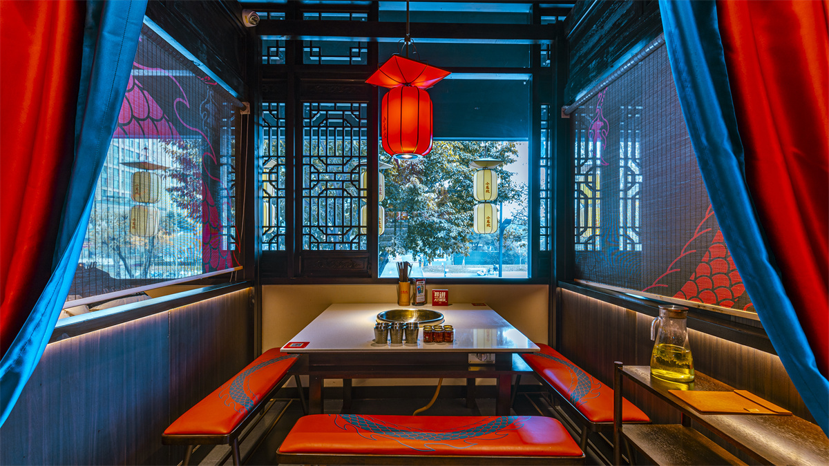 该店整体以小龙坎特色川西风格为基础,增加更具空间感的门店氛围装饰,呈现更多元化的门店氛围。源自品牌门店特有的“鱼上墙”景观,摇身一变3D立体的鲤鱼灯,加上百家姓竹编灯笼,迎接八方来客,彰显四川人的热情好客。
