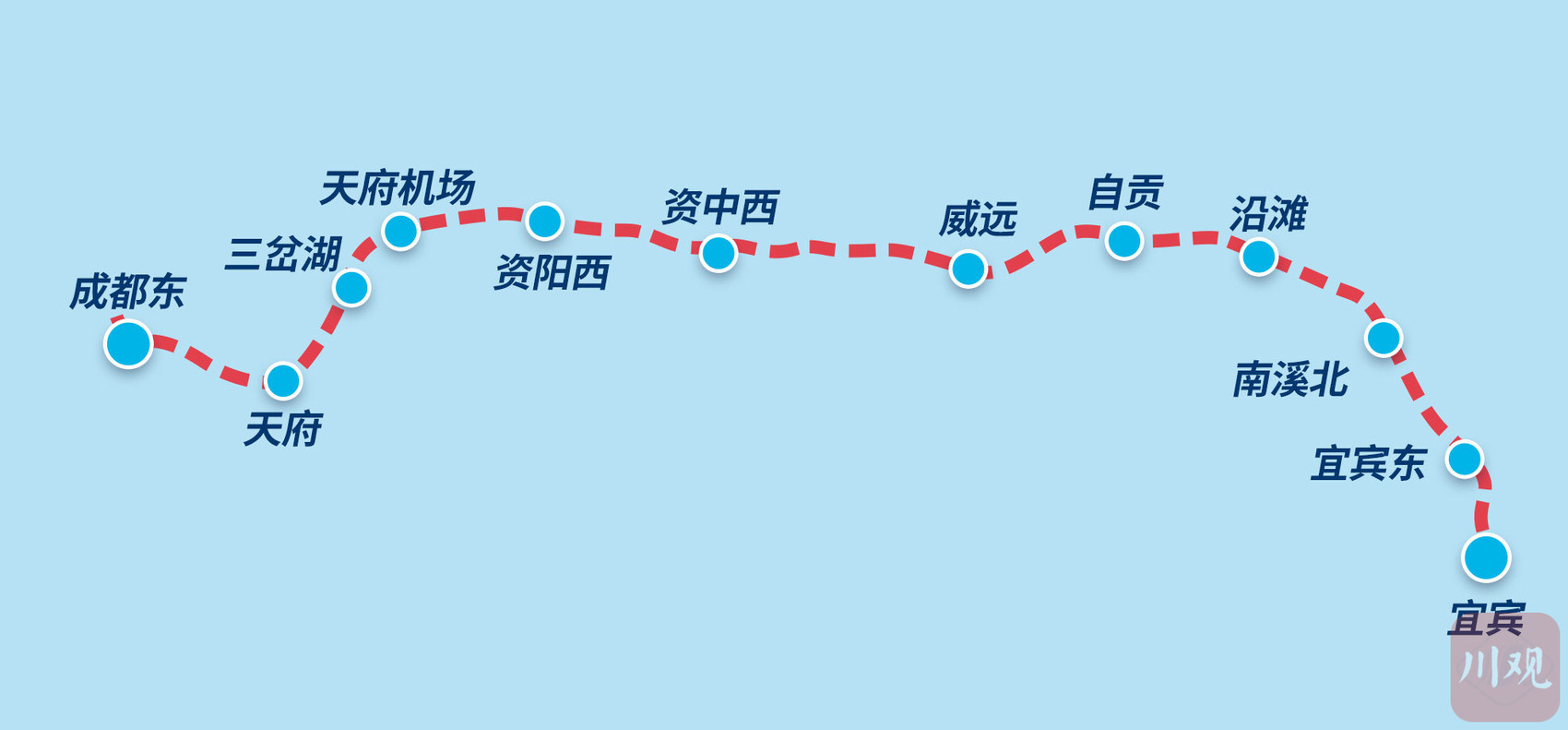 “你看,它从成都东出来后,在这里拐了个弯。”中铁二院成自项目设计总体负责人牛建青拿出成自宜高铁的路线走向图,可以看到,成自宜高铁从起点成都东站引出后,向东南方向行进,划出一个勺形的弧线,再向东而行,经过天府机场后,一条直线直奔川南城市。