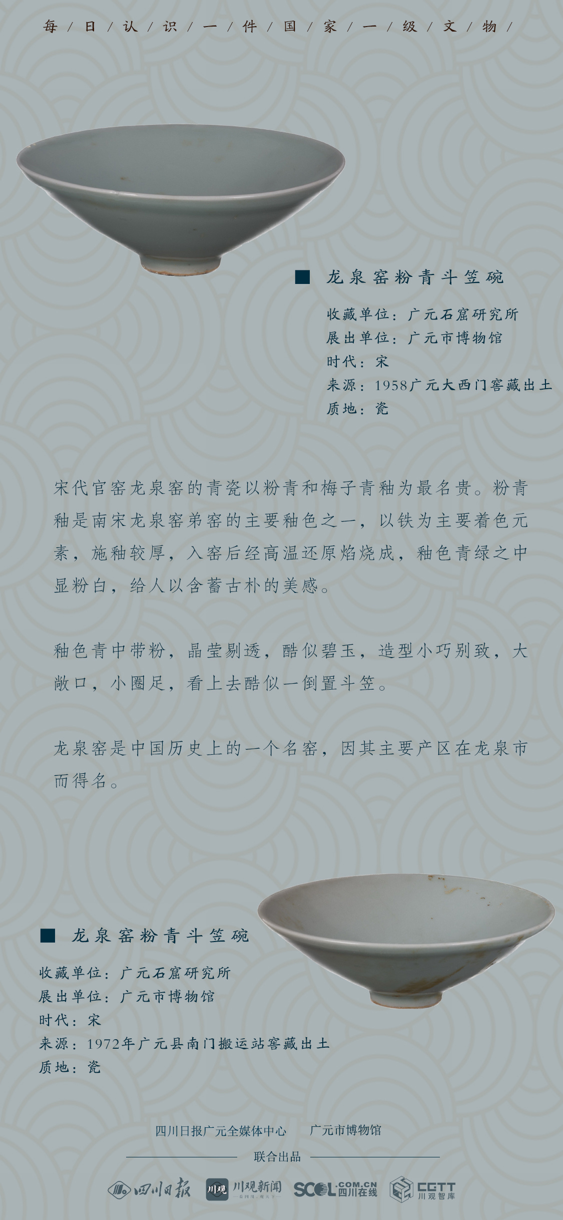 龙泉窑粉青斗笠碗,釉色青中带粉,晶莹剔透,酷似碧玉,造型小巧别致,大敞口,小圈足,看上去酷似一倒置斗笠。两件龙泉窑粉青斗笠碗的收藏单位均为广元石窟研究所,目前在广元市博物馆进行展览。