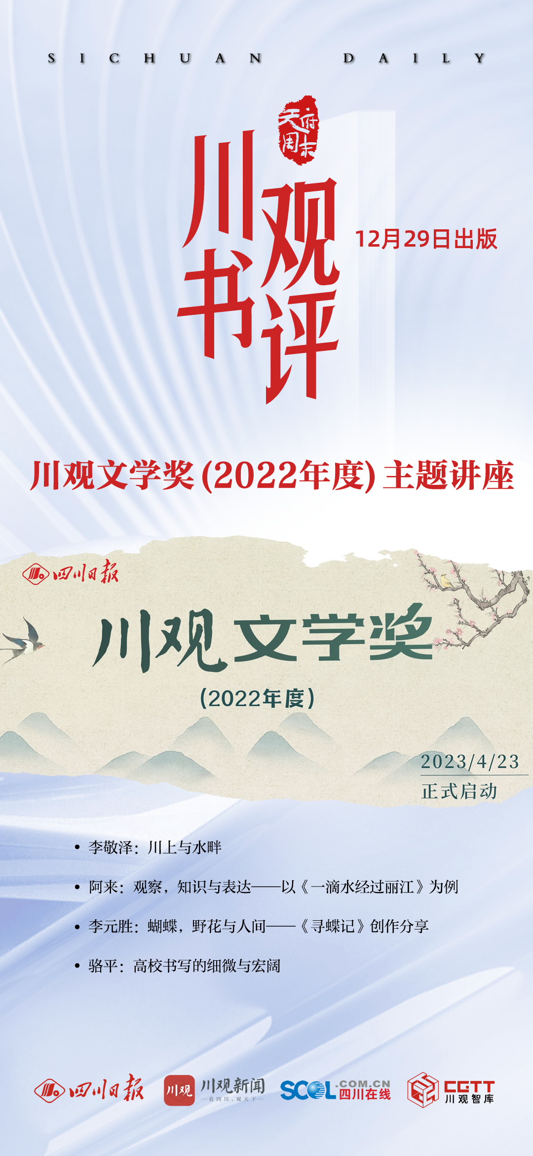 主题讲座是“金牛·川观文学季”2022年度川观文学奖颁奖典礼重磅活动之一——12月8日,中国作协副主席、四川省作协主席阿来现身成都七中万达学校,为同学们主讲“观察,知识与表达——以《一滴水经过丽江》为例”;12月9日上午,中国作协副主席、书记处书记李敬泽走进成都金牛区图书馆,以“川上与水畔”为题,为现场观众展开了一场颇具人文魅力的文学讲座;12月9日上午,鲁迅文学奖、川观文学奖获得者,重庆市作协副主席、著名诗人李元胜现身成都市金牛区跃进社区跃进剧场,为社区居民和文学爱好者们带来“蝴蝶,野花与人间——《寻蝶记》创作分享”;12月10日上午,作家、四川省作协副主席、四川师范大学二级教授骆平现身成都市金牛区方庭书店,为广大文学爱好者们带来“高校书写的细微与宏阔”……应读者要求,《川观书评》月刊特节选整理推出系列讲座实录,以飨读者。