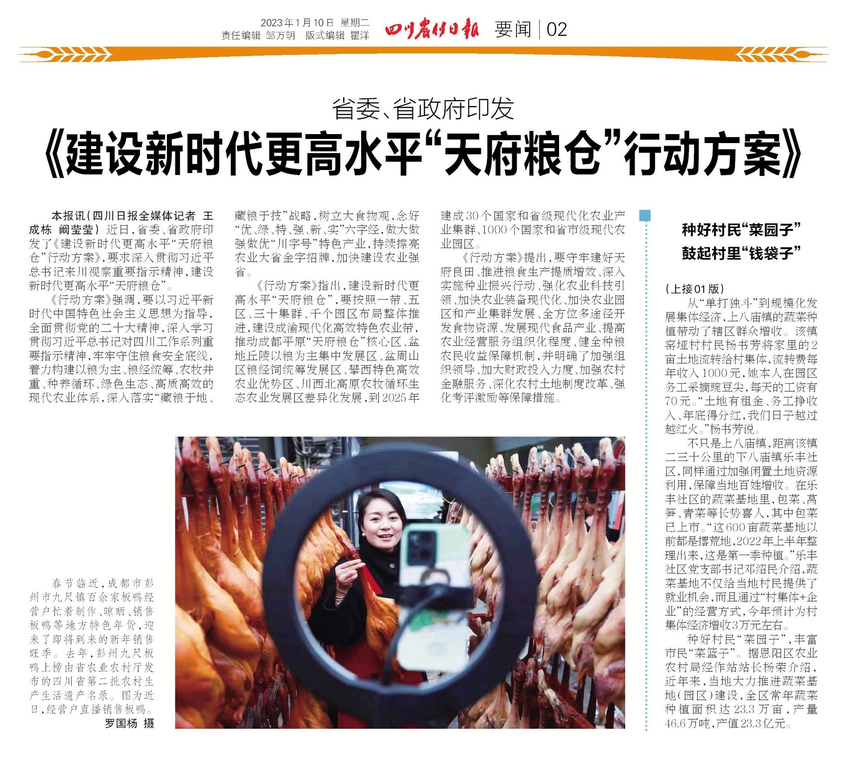 年初,省委、省政府印发《建设新时代更高水平“天府粮仓”行动方案》,提出要守牢建好天府良田、推进粮食生产提质增效、深入实施种业振兴行动、强化农业科技引领……