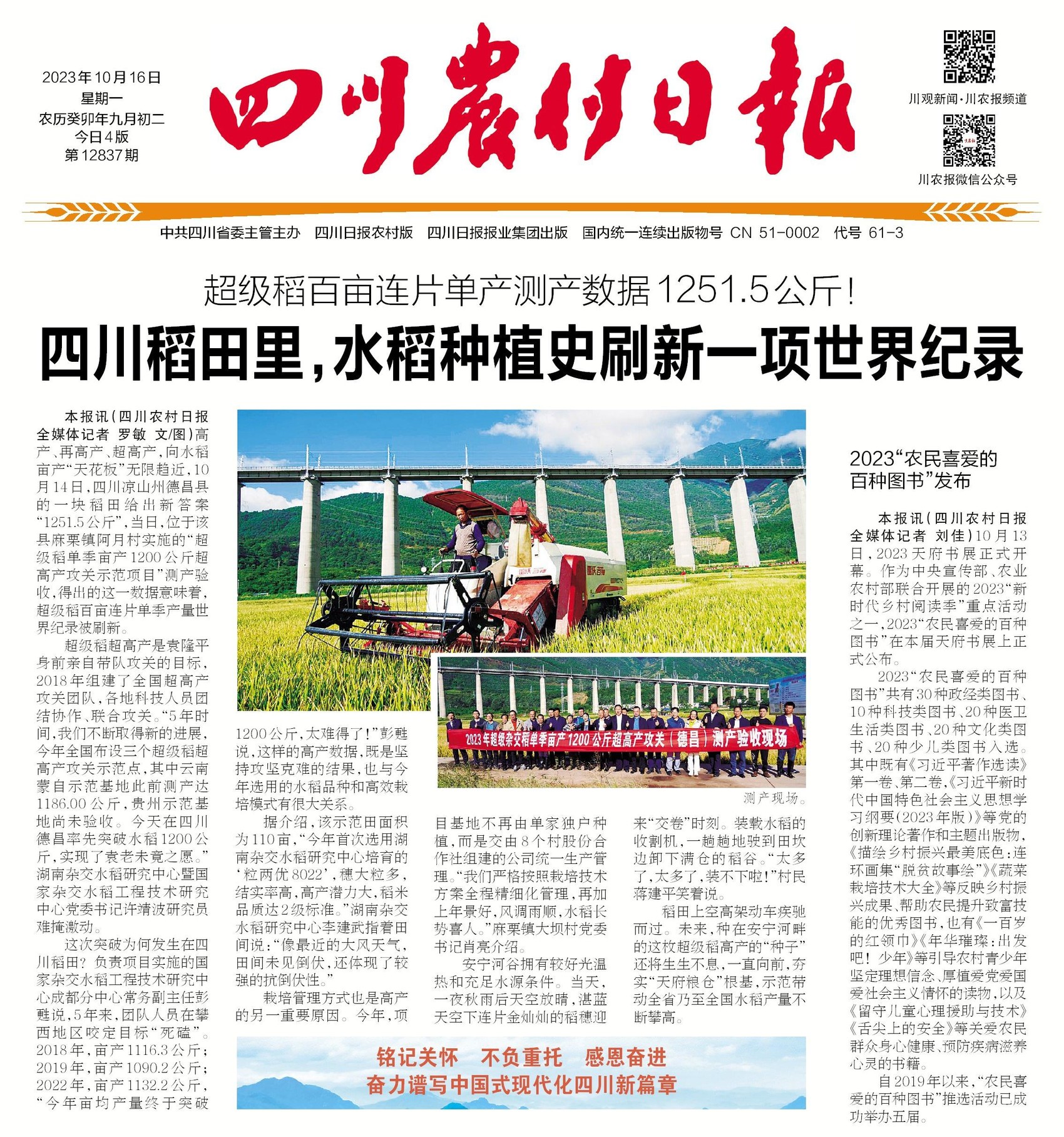 10月14日,四川凉山州德昌县麻栗镇阿月村实施的“超级稻单季亩产1200公斤超高产攻关示范项目”测产验收,最终测出超级稻百亩连片单产测产数据1251.5公斤的亮眼成绩!超级稻百亩连片单季产量世界纪录被刷新。